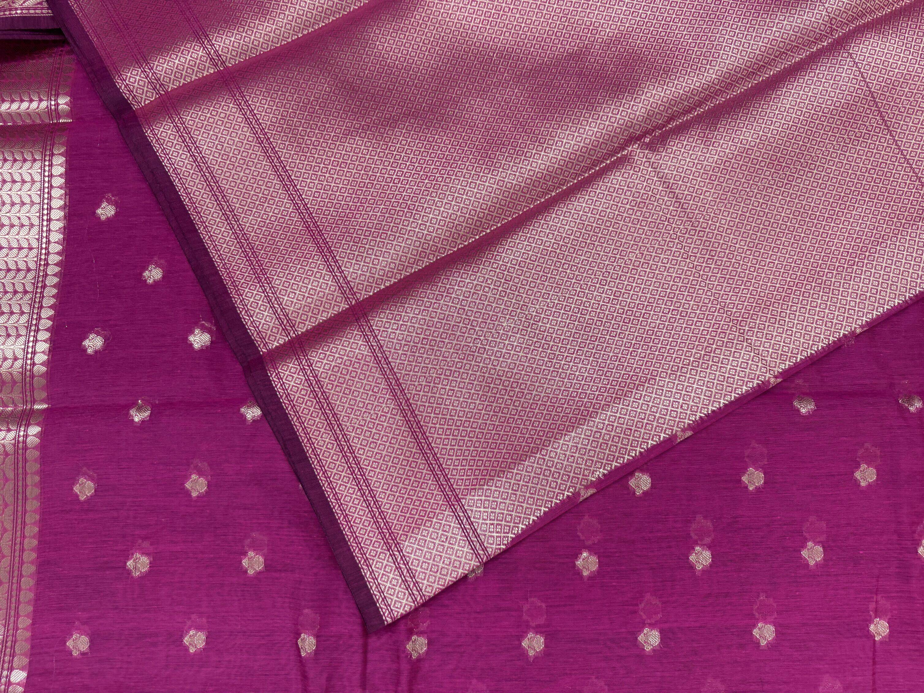 Magenta colour Banarasi silk saree with silver brocade border and pallu with traditioal floral motifs, Magenta colour blouse with silver brocade weavings .