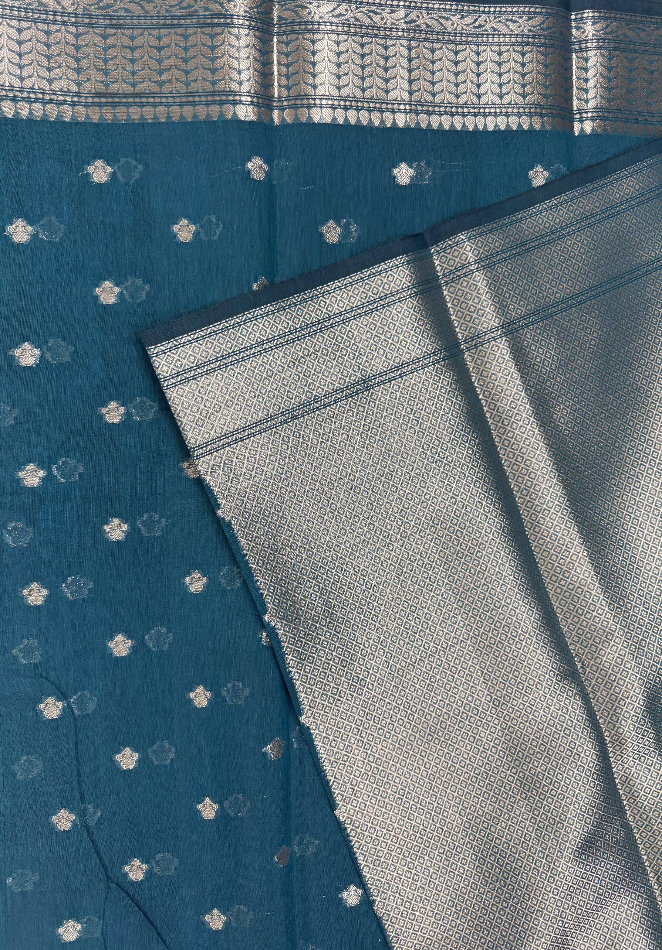 Teal Blue colour Banarasi silk saree with silver brocade border and pallu with traditioal floral motifs, Teal Blue colour blouse with silver brocade weavings .
