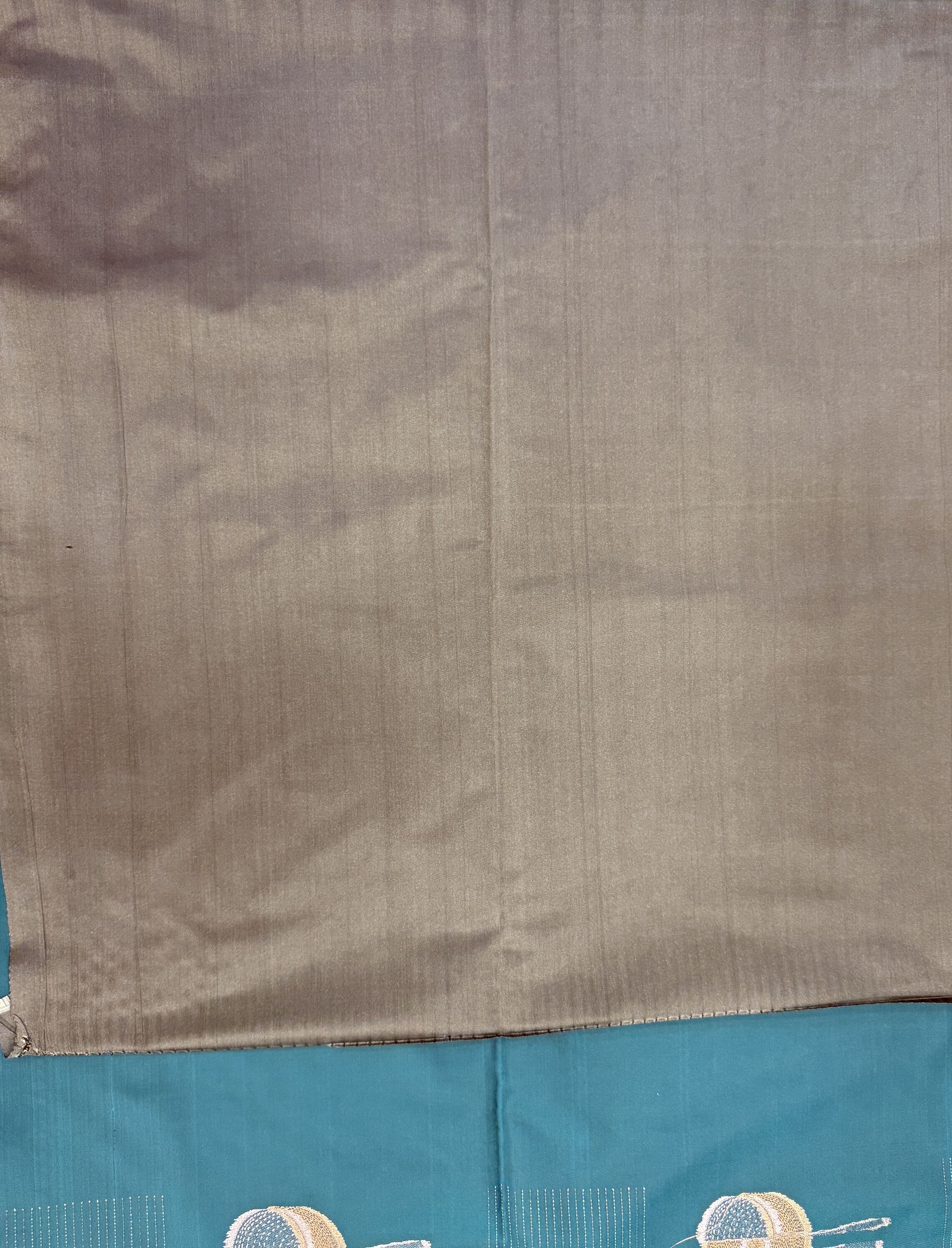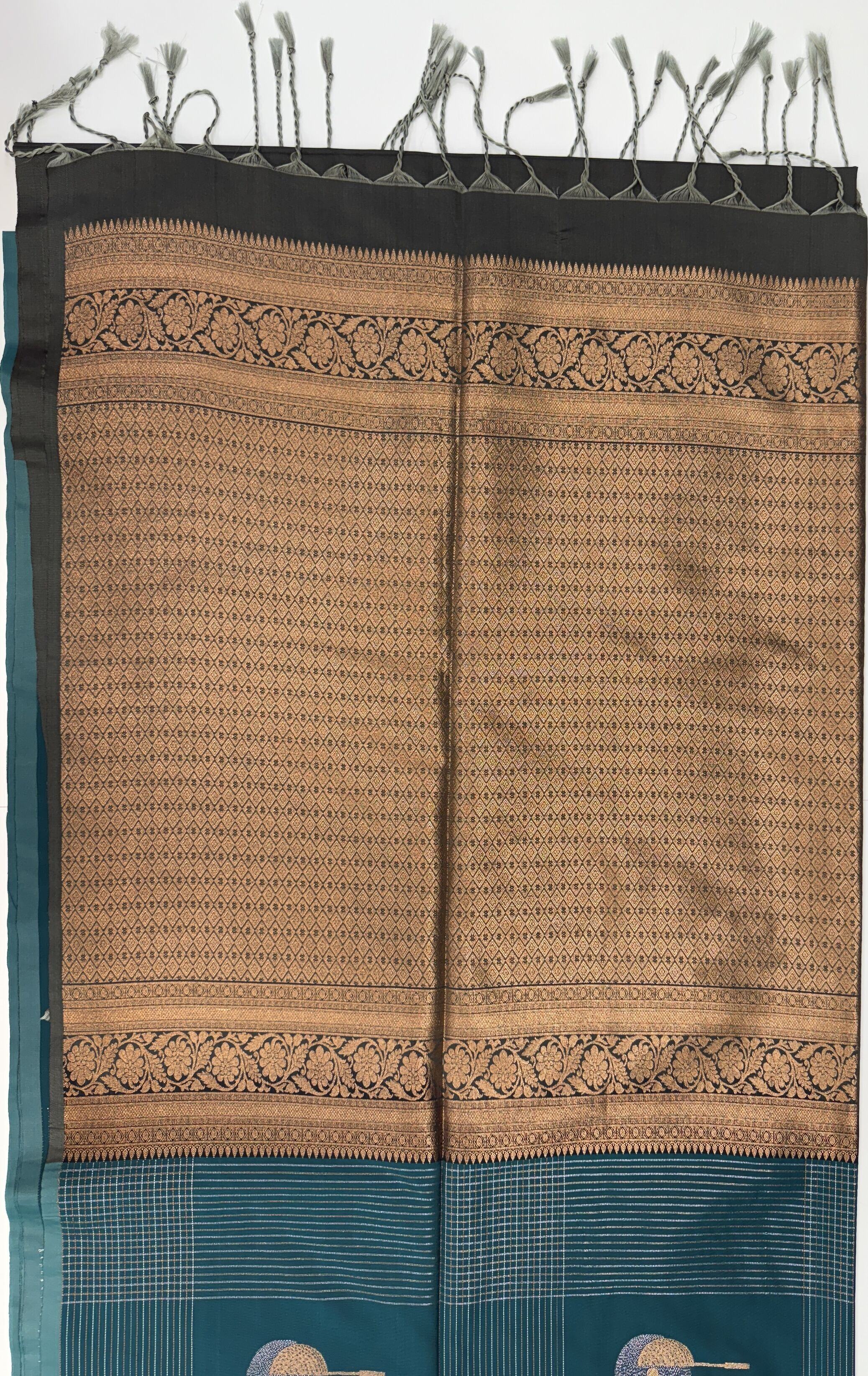 Green colour Soft Silk saree and body with golden jari lines and simple patterns, Contrast blouse with copper gold zari floral motifs and small geometric patterns.