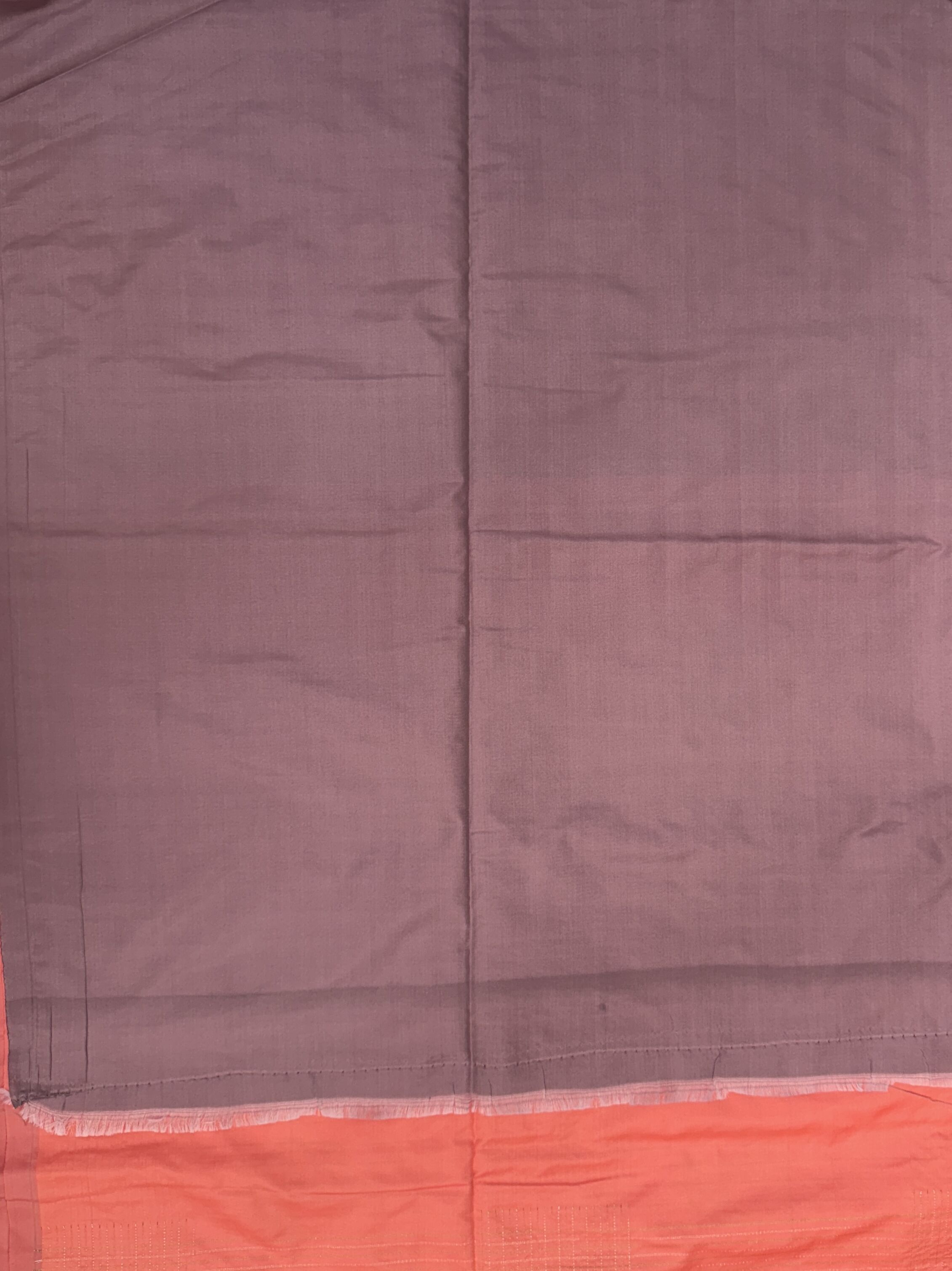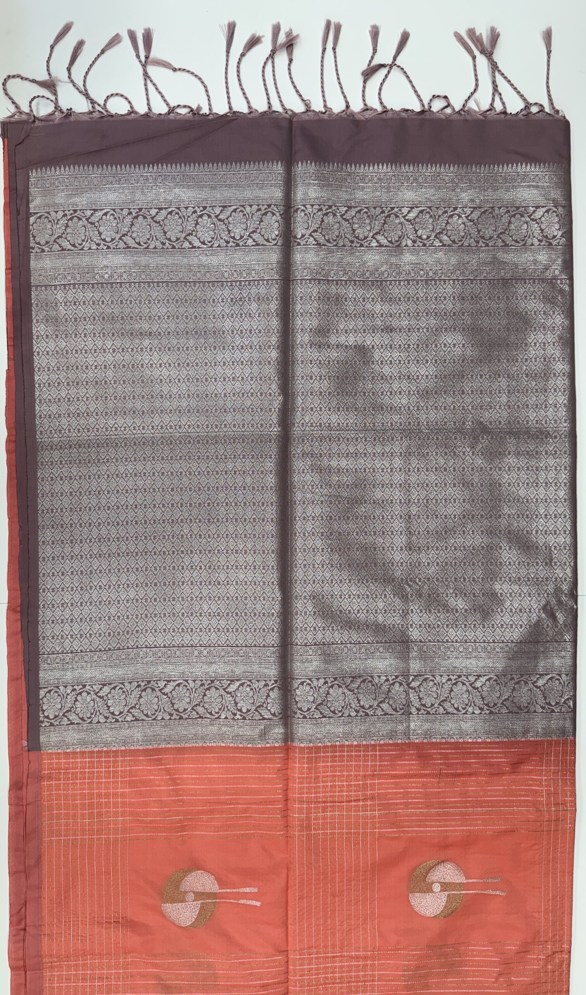 Orange colour Soft Silk saree and body with silver zari lines and simple patterns, Contrast blouse with silver zari floral motifs and small geometric patterns.