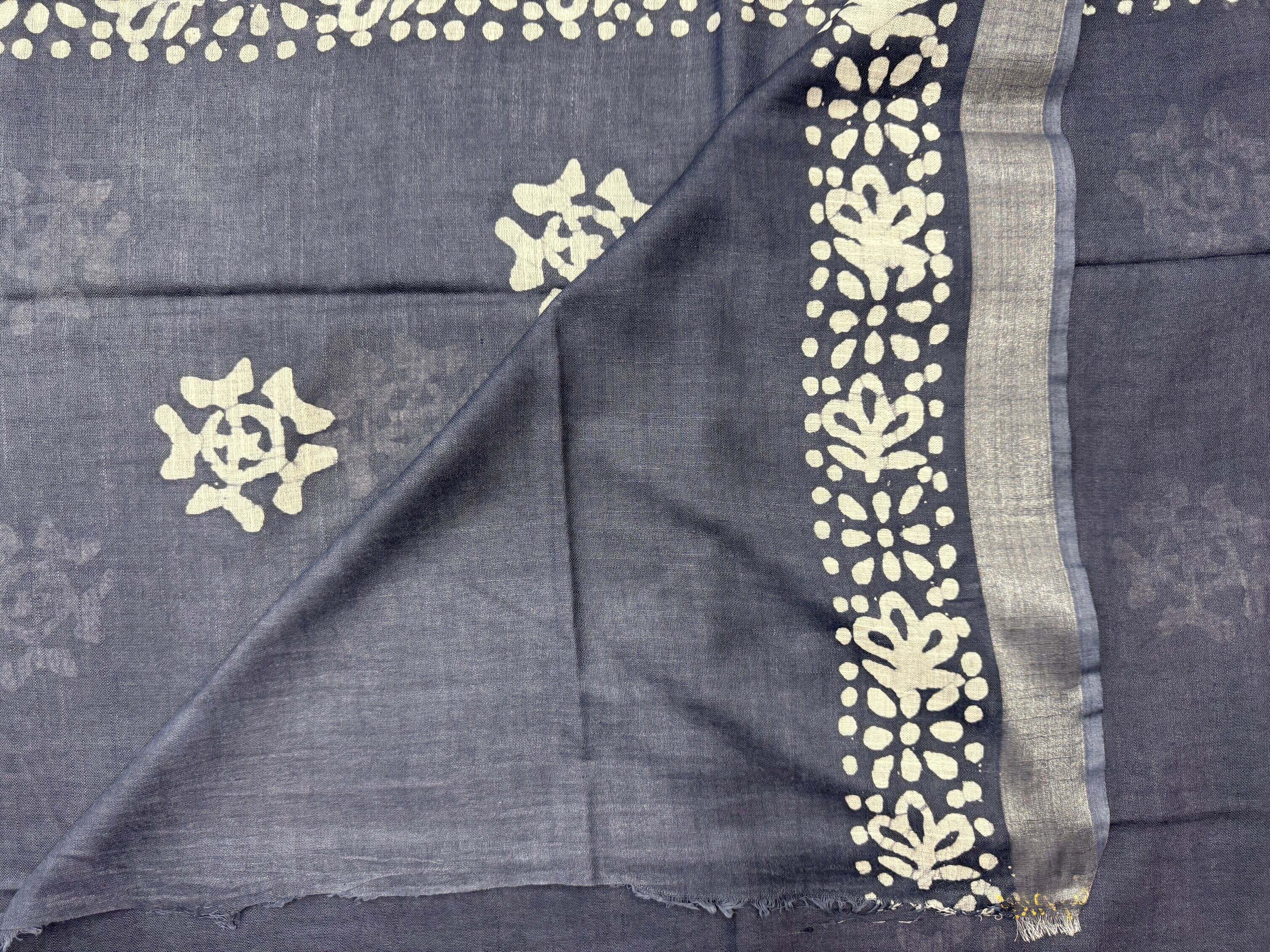 Greycolour linen saree with white floral patterns in the body, Grey colour blouse with same white floral patterns.