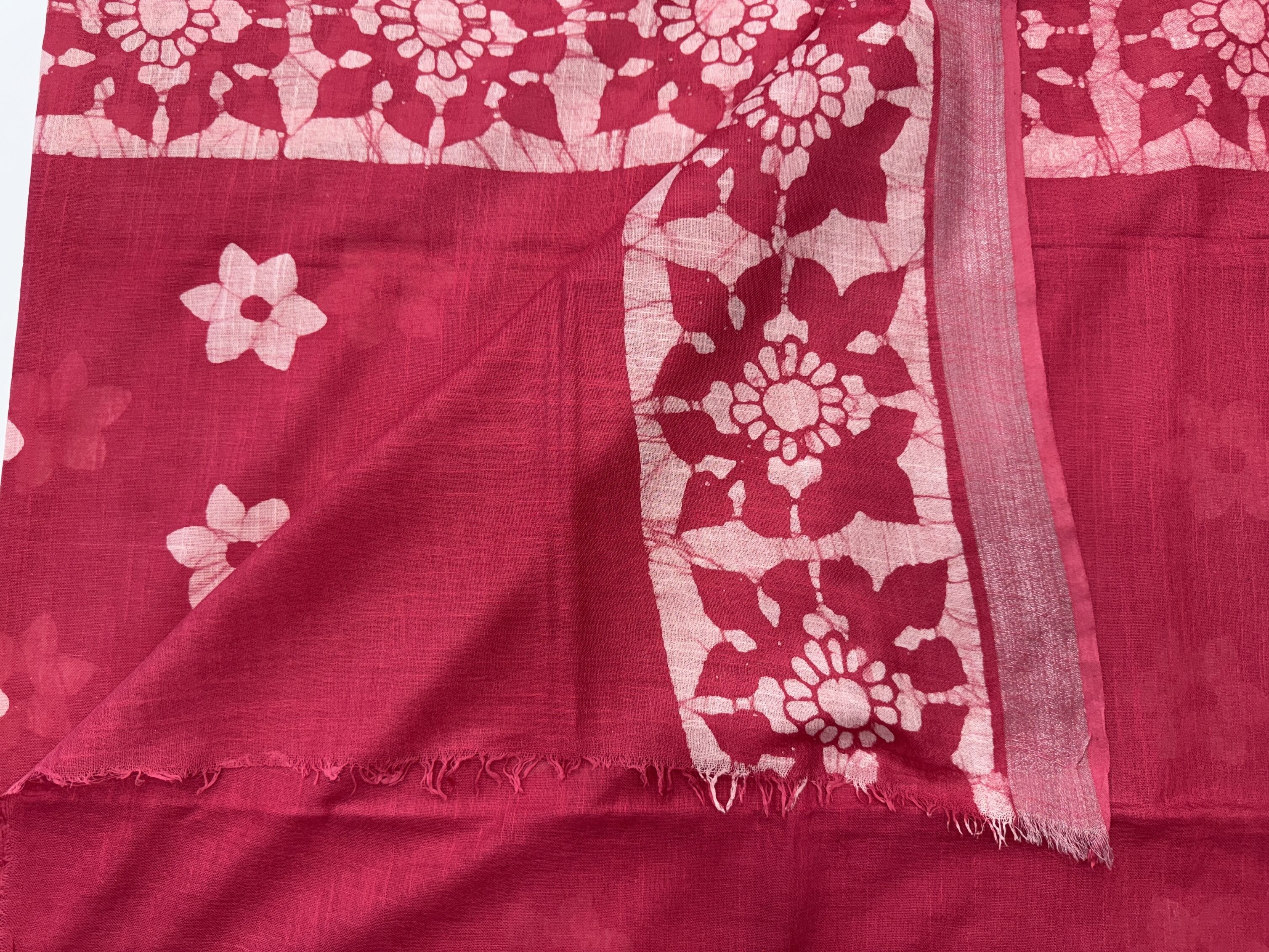 Pink colour linen saree with white floral patterns in the body, Pink colour blouse with same white floral patterns.