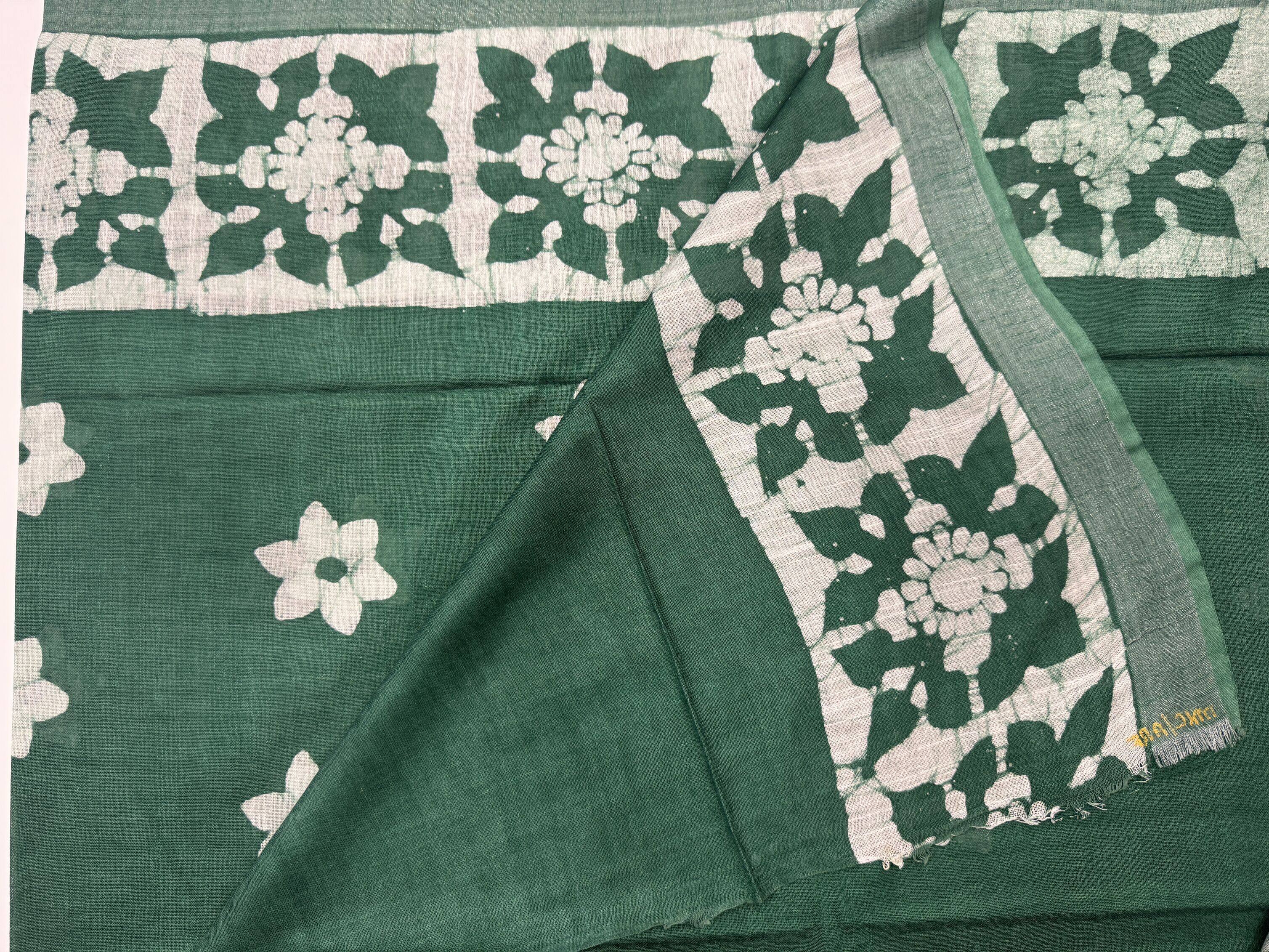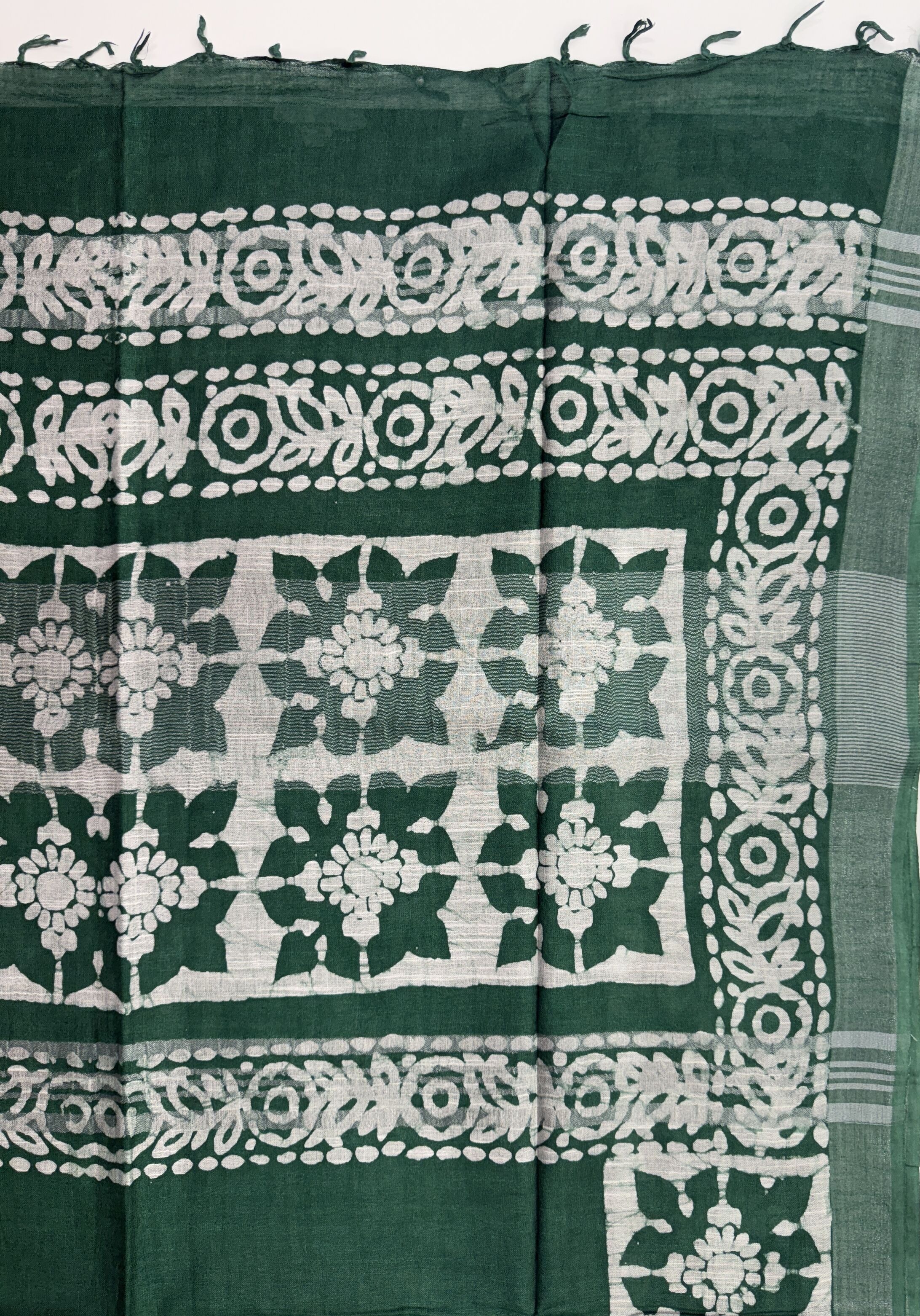 Green colour linen saree with white floral patterns in the body, Green colour blouse with same white floral patterns.