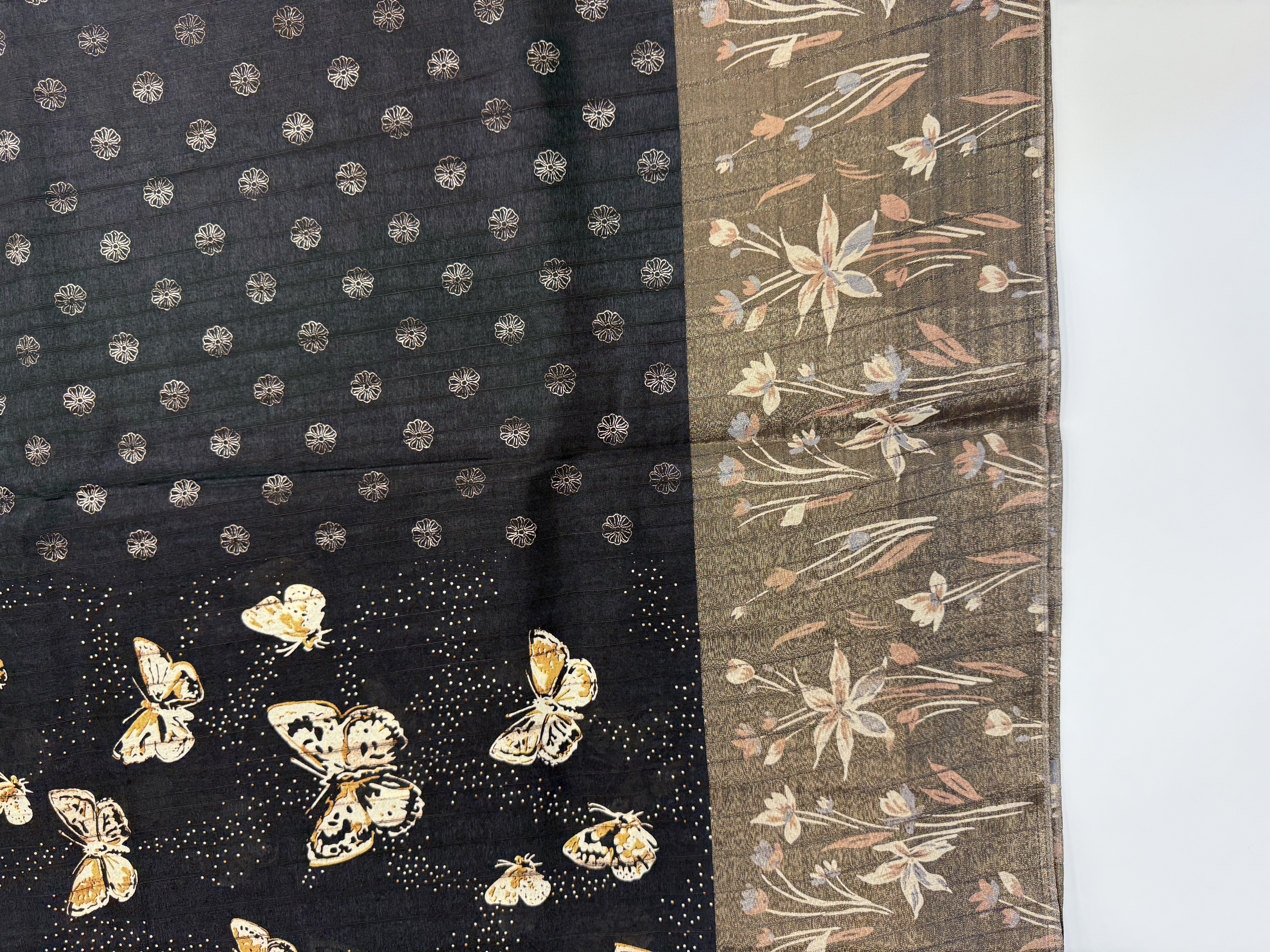 Semi Tussar Saree Black in Colour with Butterfly Pattern in body with Silver Gray Boder with Half White Dot's Around Butterflies. Running Blouse with Flower Butta's with 3 inches with Running Silver Gray Zari Boder.