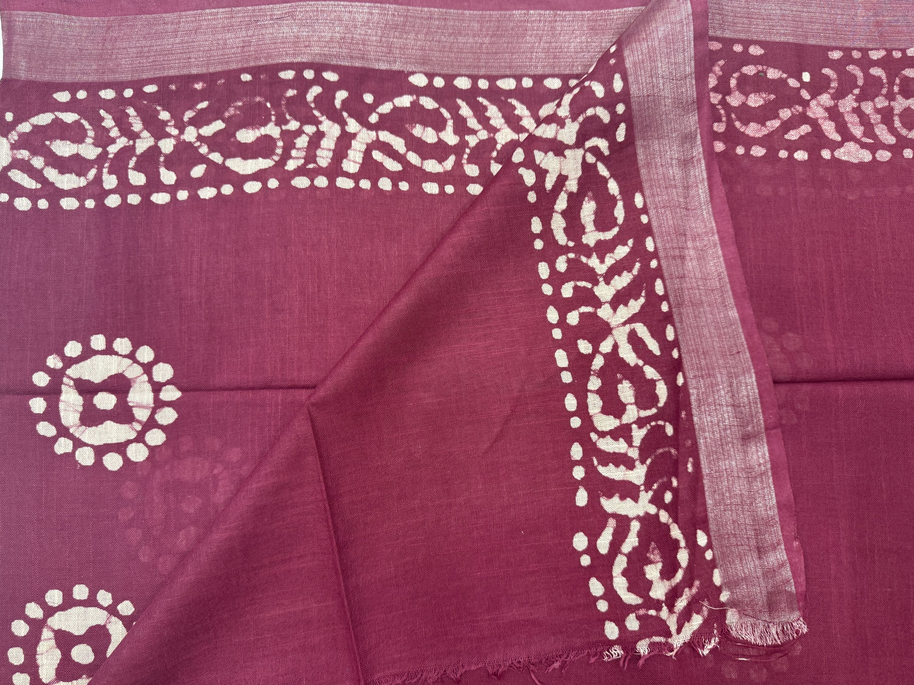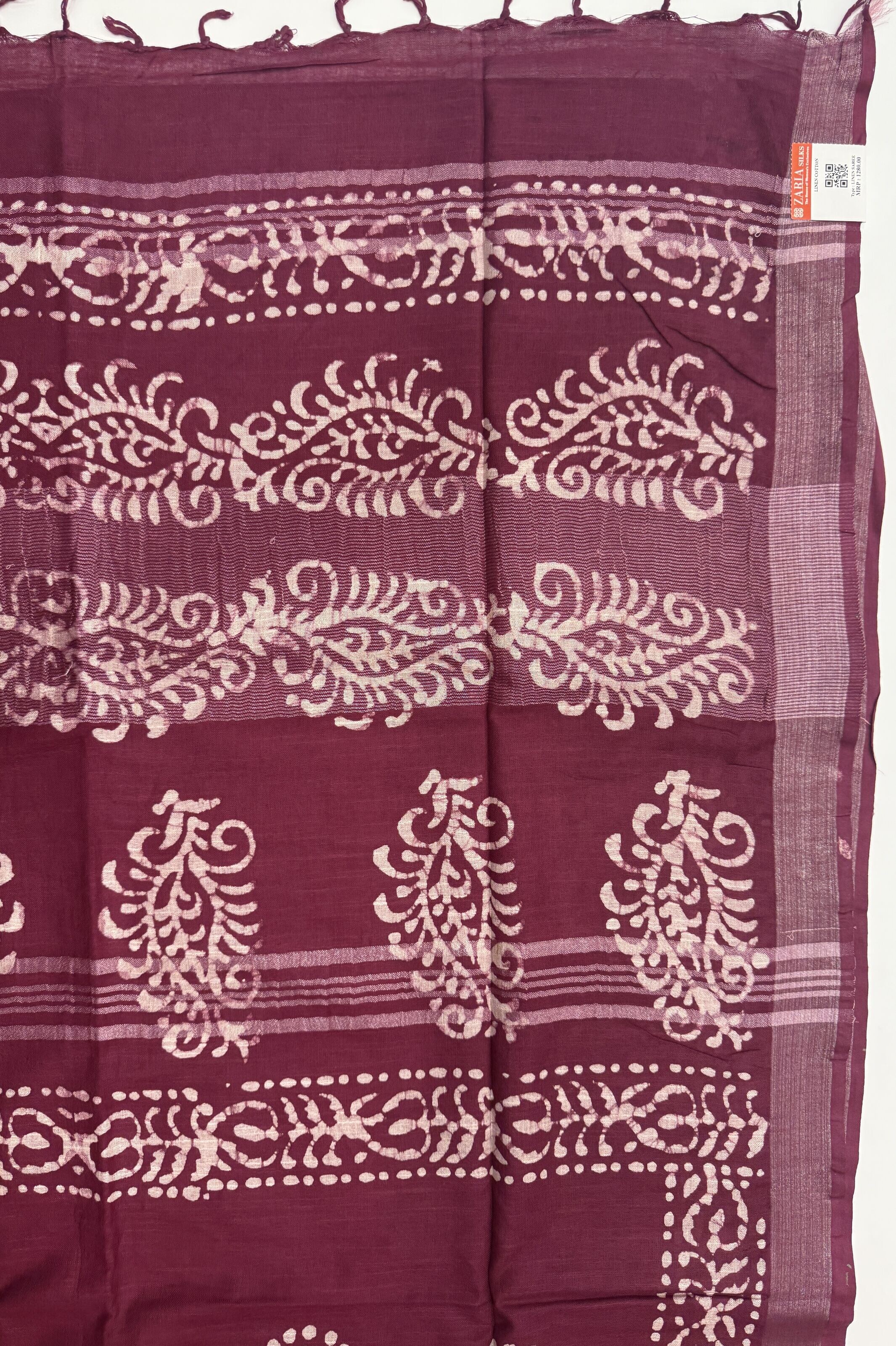 Purple colour linen saree with white floral patterns in the body, Purple colour blouse with same white floral patterns.