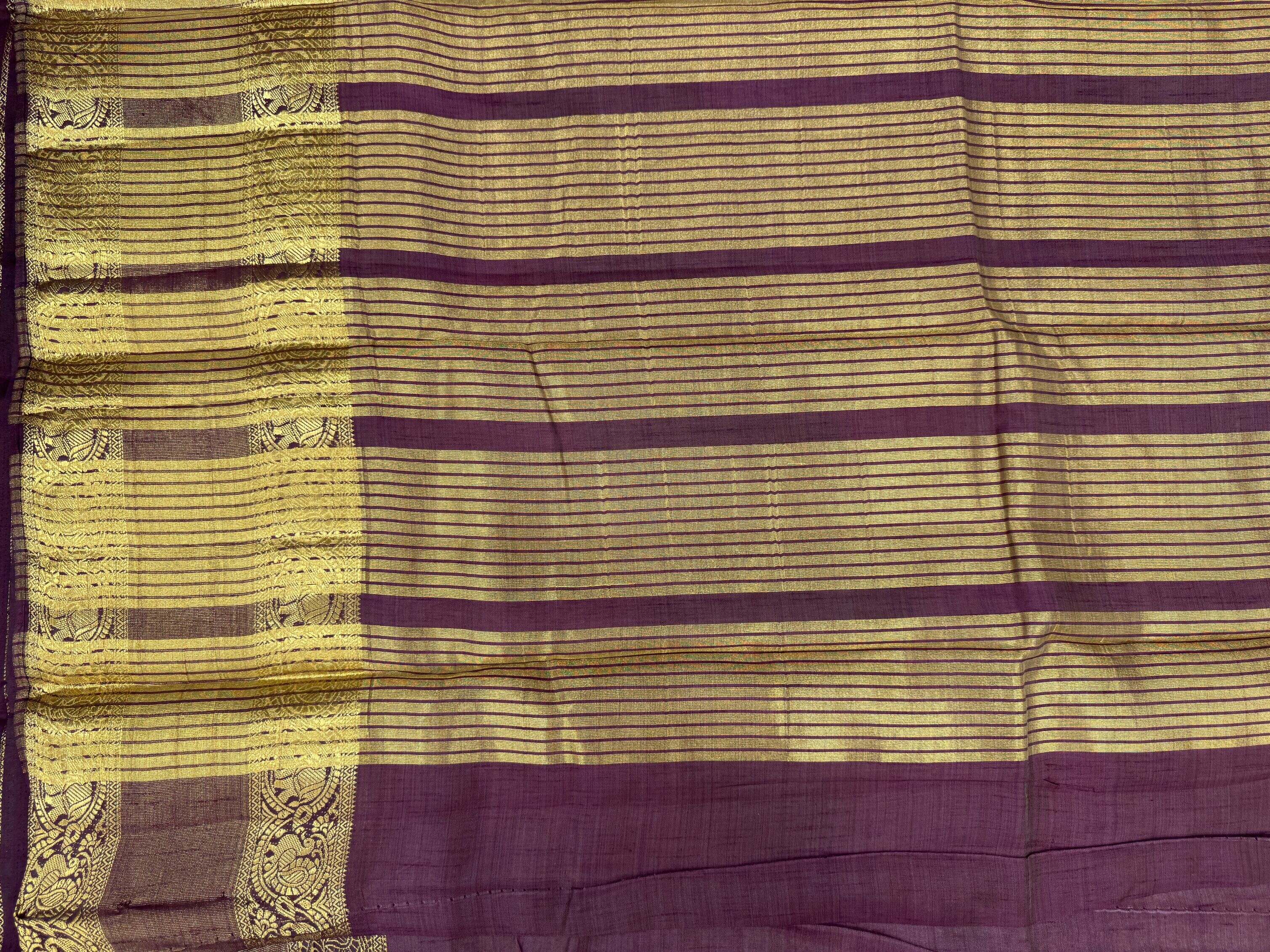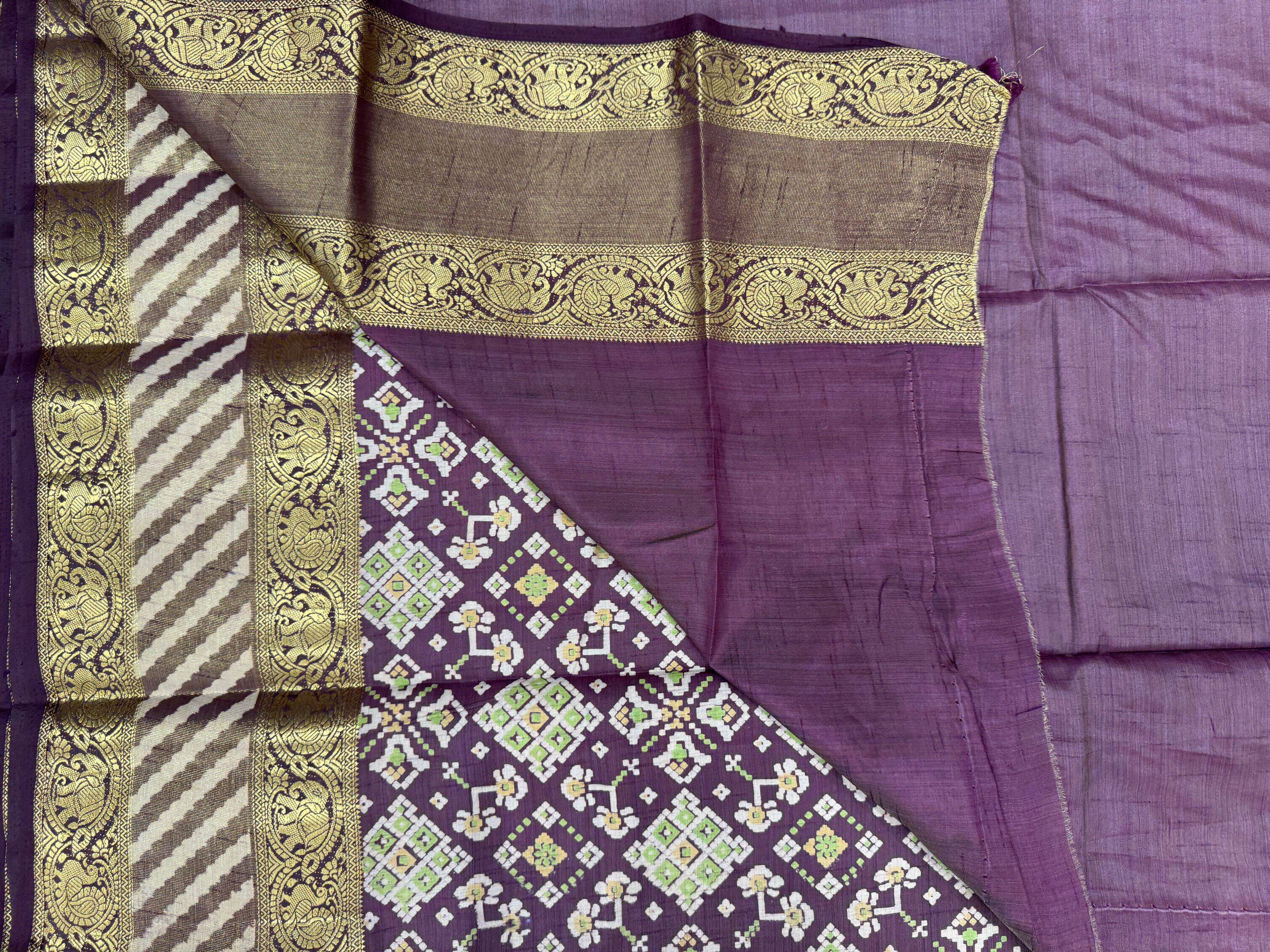 Violet colour saree and patola print patterns in the body, with gold zari border. plain violet blouse with zari border.
