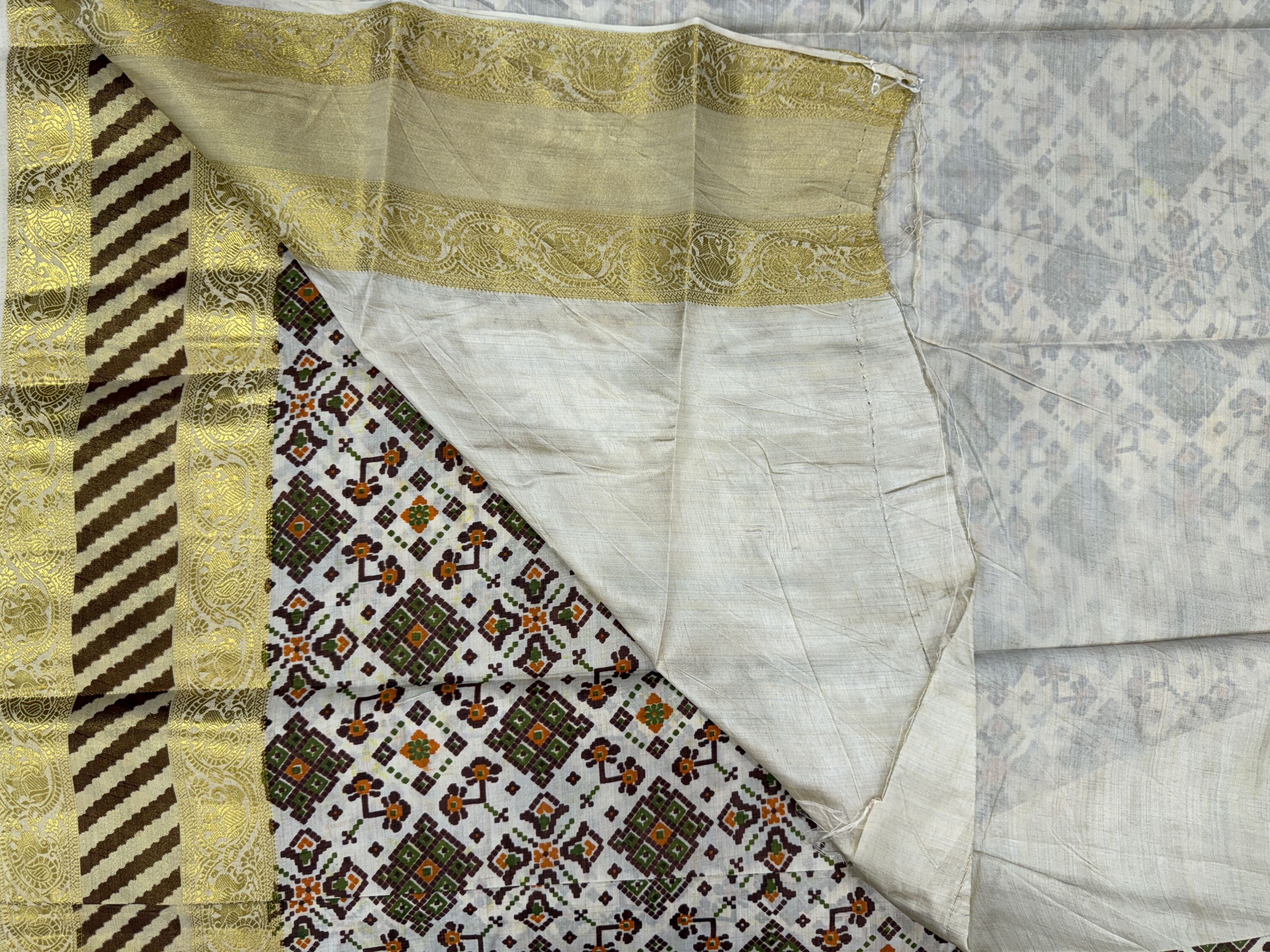 Cream colour saree and patola print patterns in the body, with gold zari border. plain cream blouse with zari border