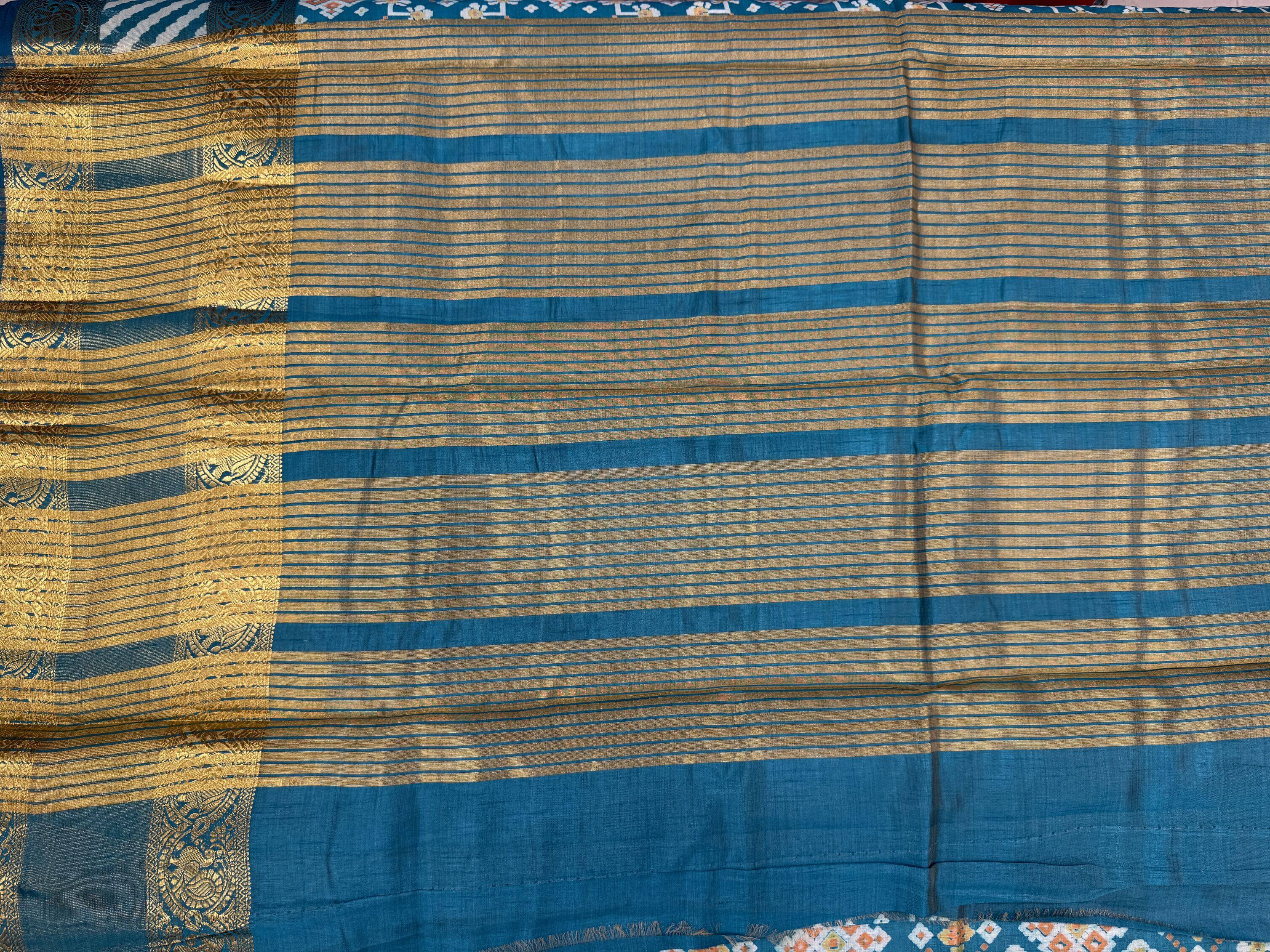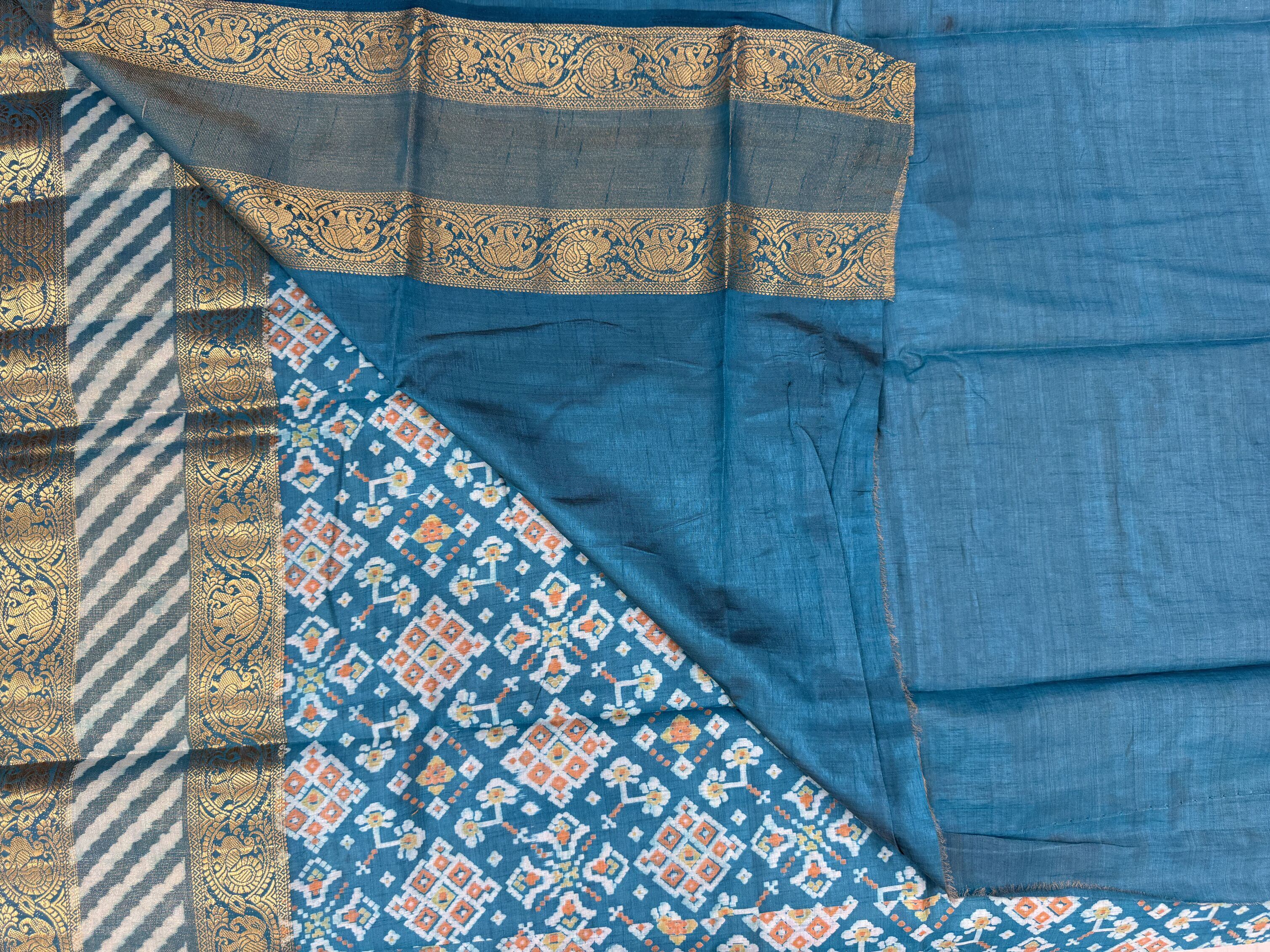 Light blue colour saree and patola print patterns in the body, with gold zari border. plain light blue blouse with zari border.