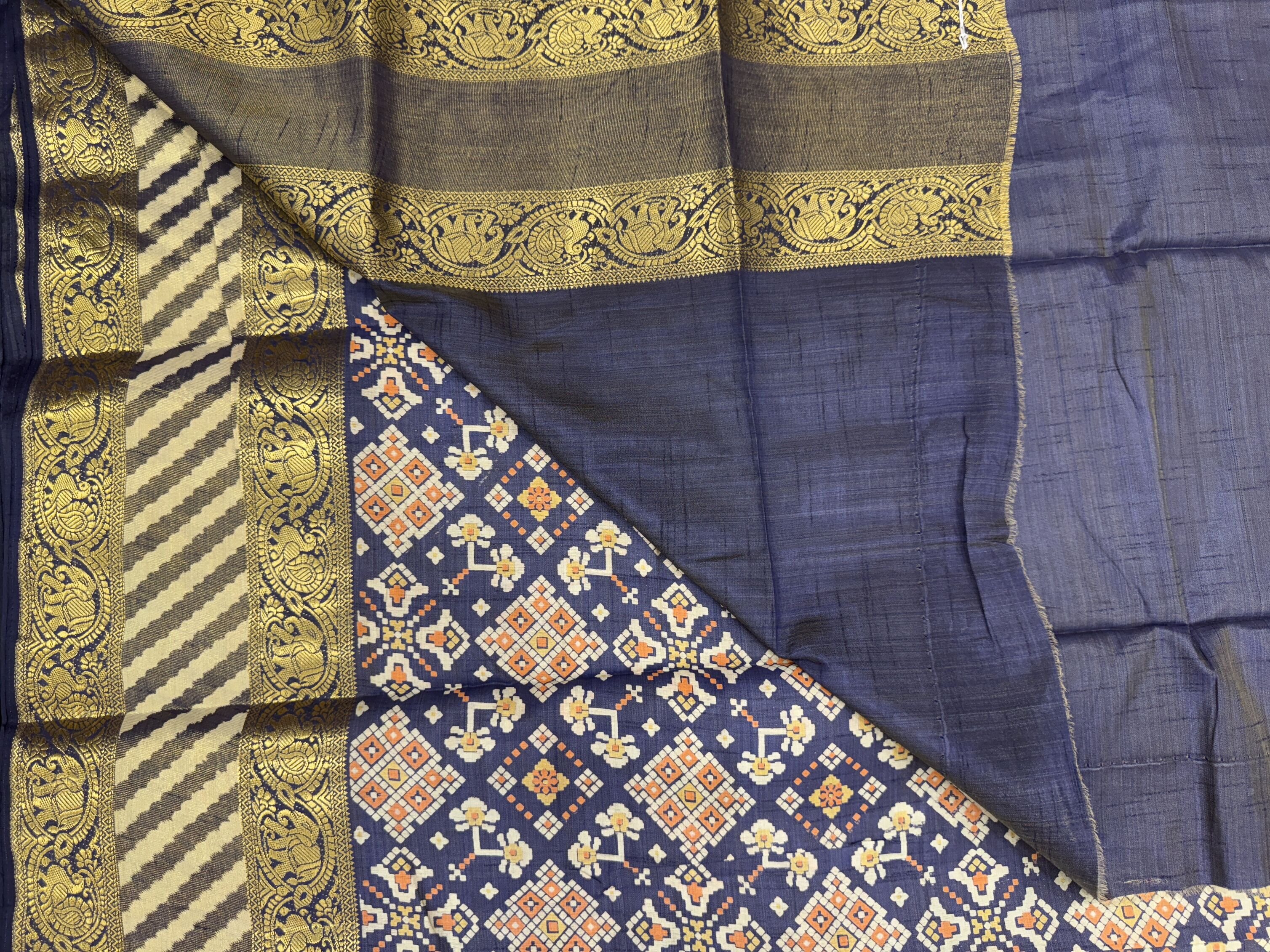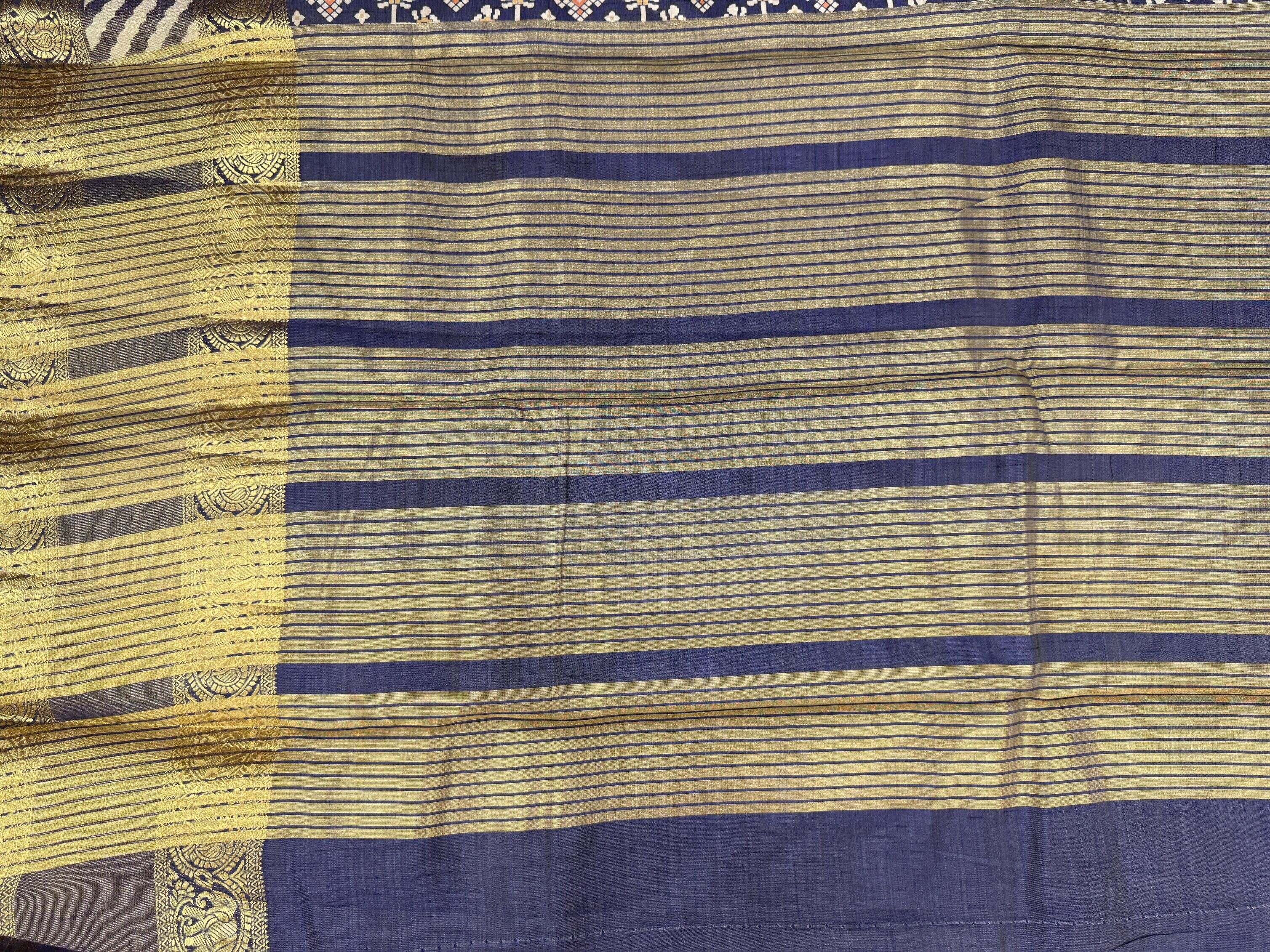 Navy blue colour saree and patola print patterns in the body, with gold zari border. plain navy blue blouse with zari border.