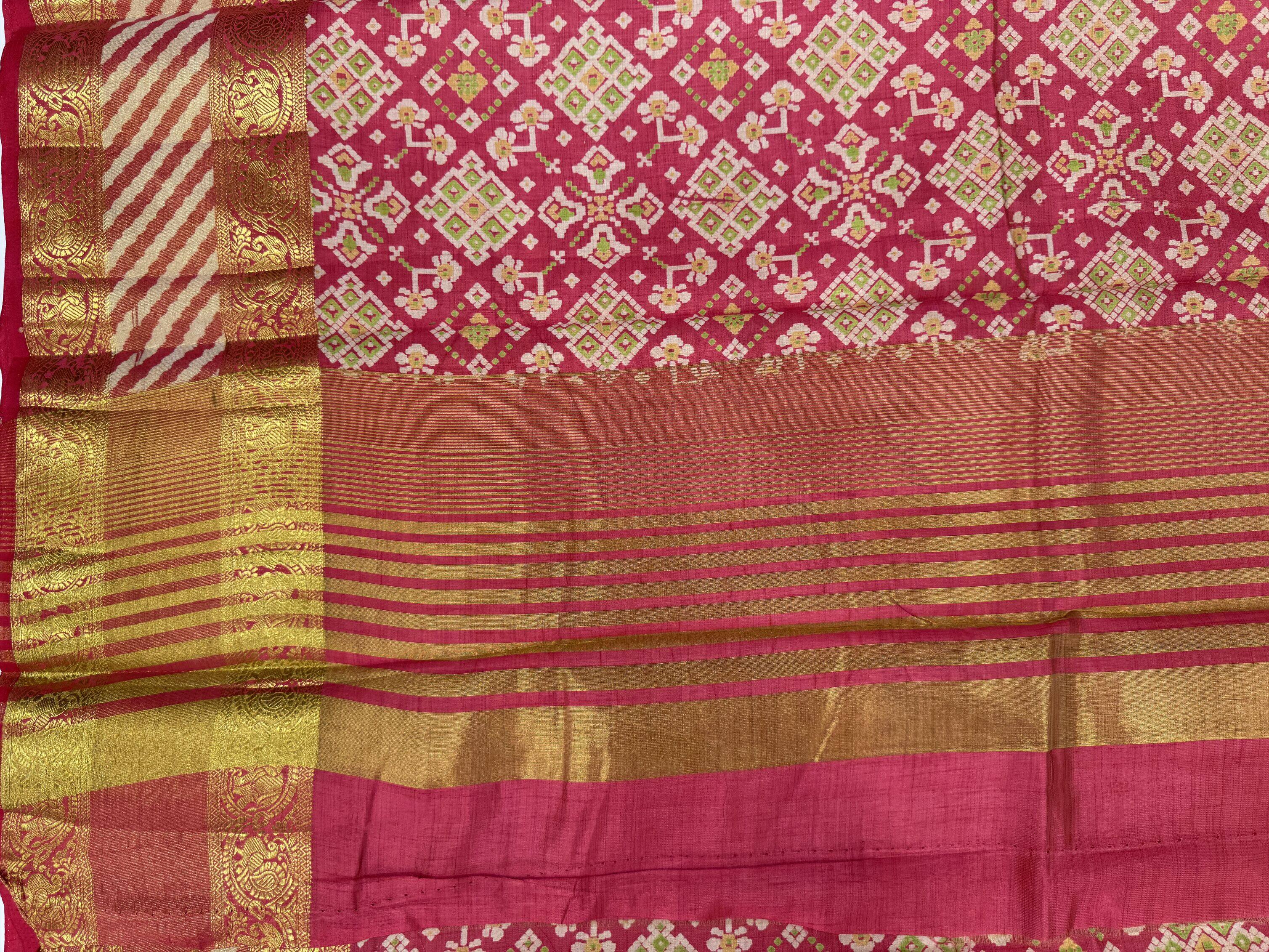 Red colour saree and patola print patterns in the body, with gold zari border. plain red blouse with zari border