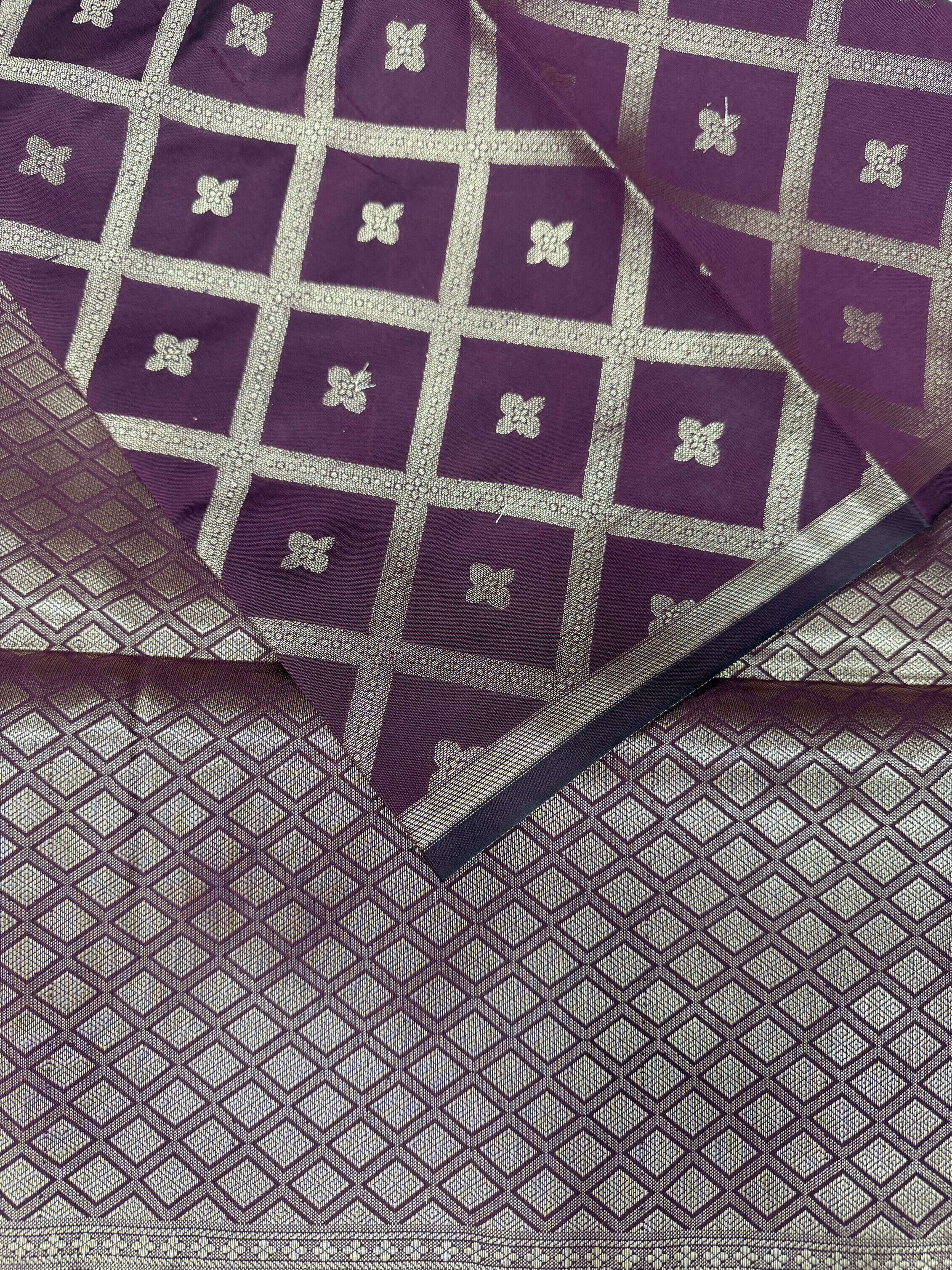 The saree features a prominent geometric pattern composed of interlocking diamond shapes.Within each diamond shape is a small, stylized floral motif in traditional Indian textiles. The contrasting wine base color and gold motifs create a classic and elegant look.