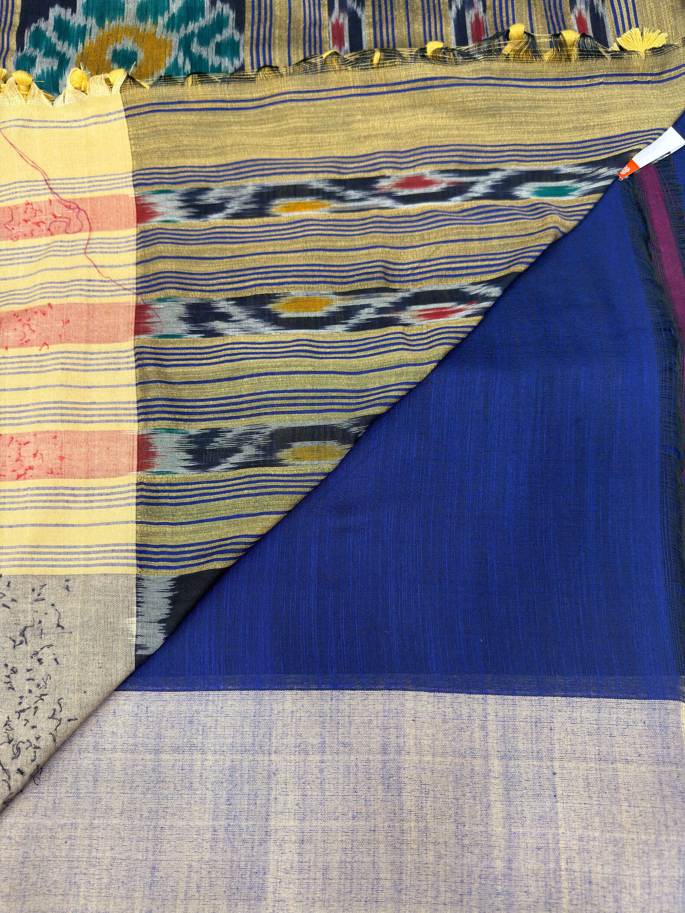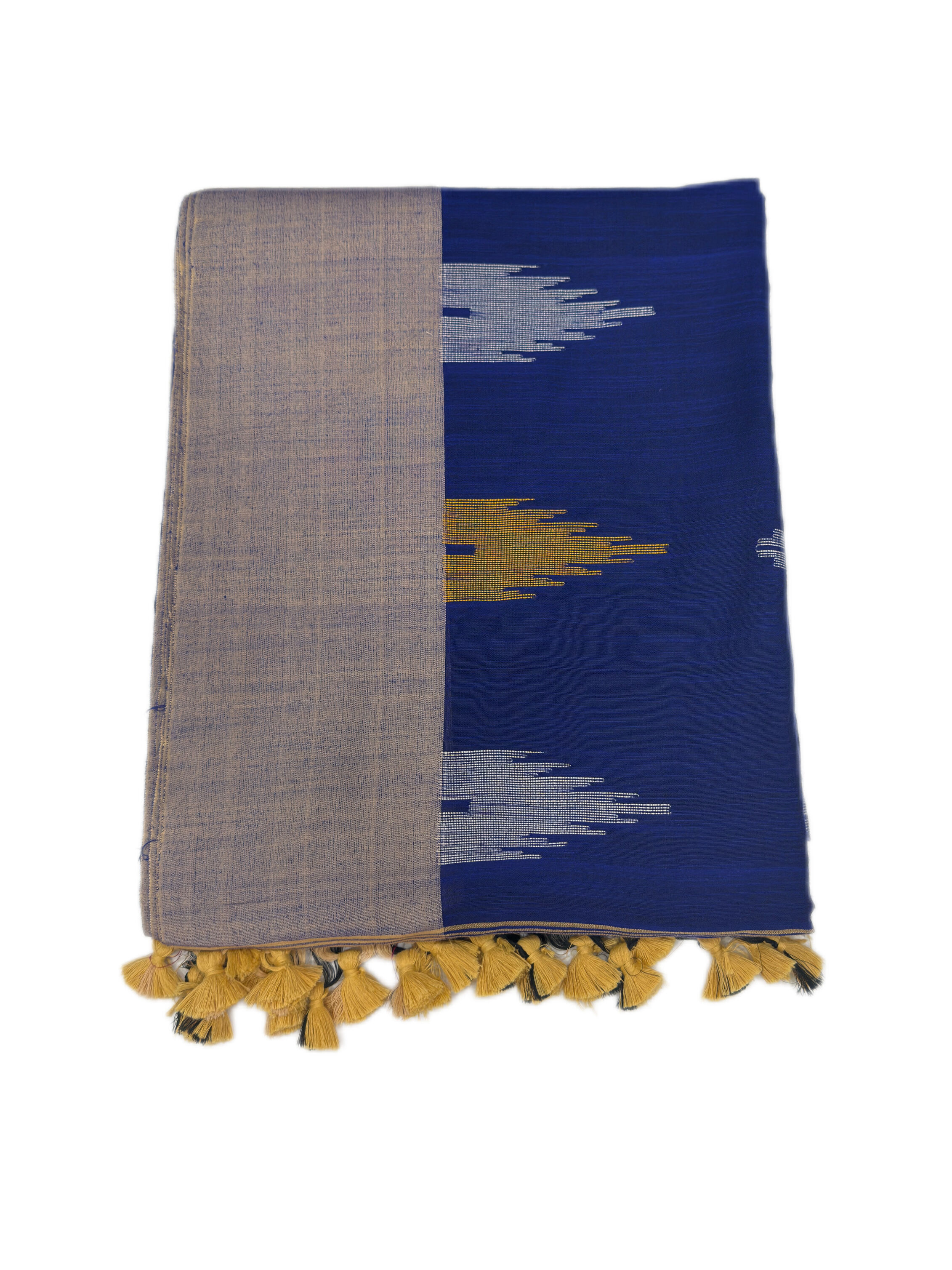Traditional ikat design pallu with tassels. full body geometric butta and thalampoo design with border.