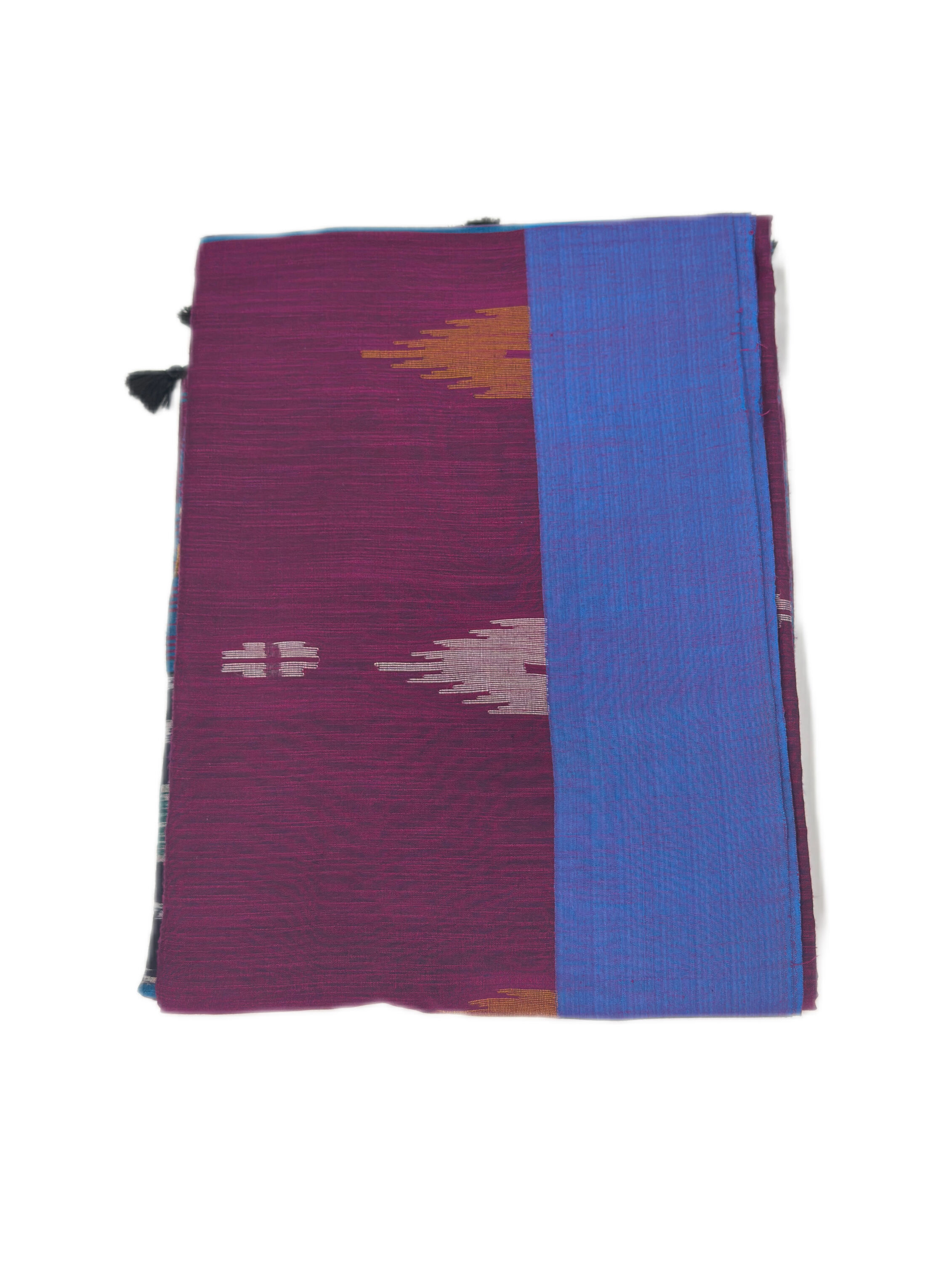 Traditional ikat design pallu with tassels. full body geometric butta and thalampoo design with border.