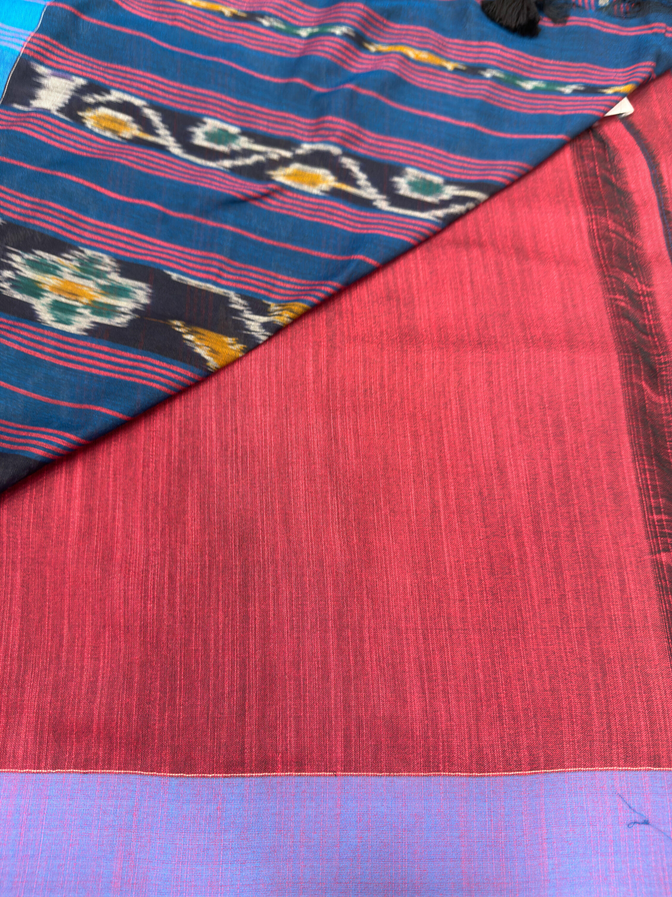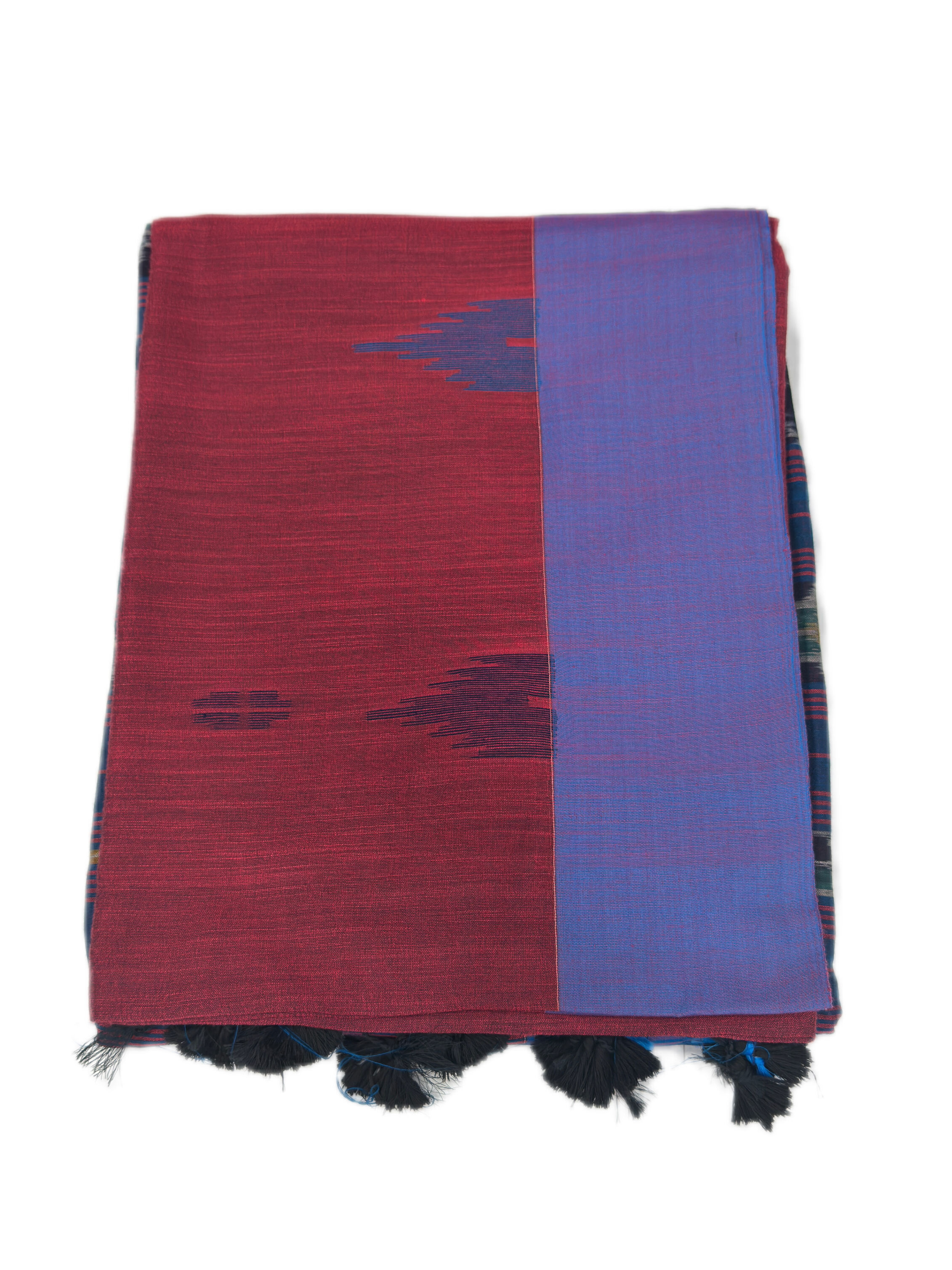 Traditional ikat design pallu with tassels. full body geometric butta and thalampoo design with border.