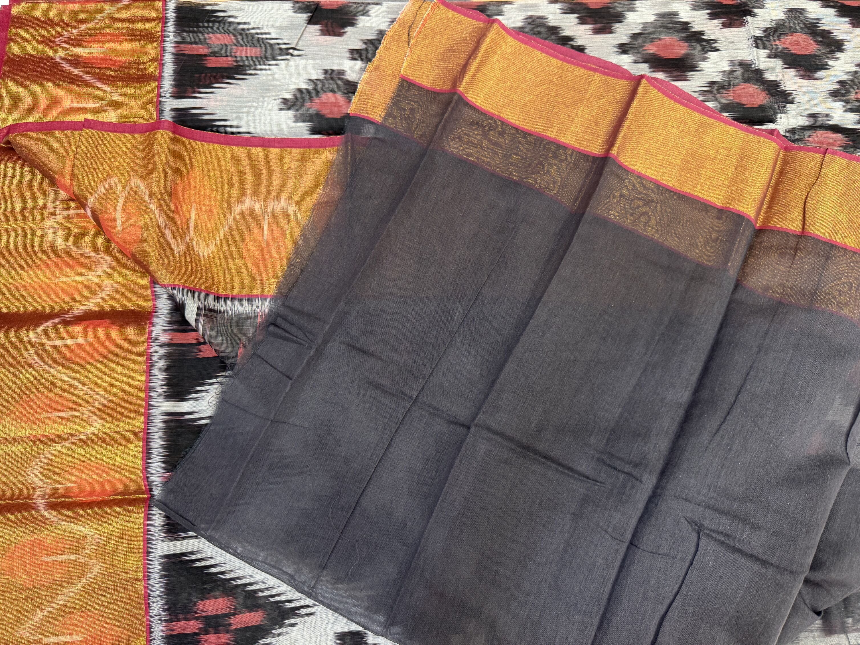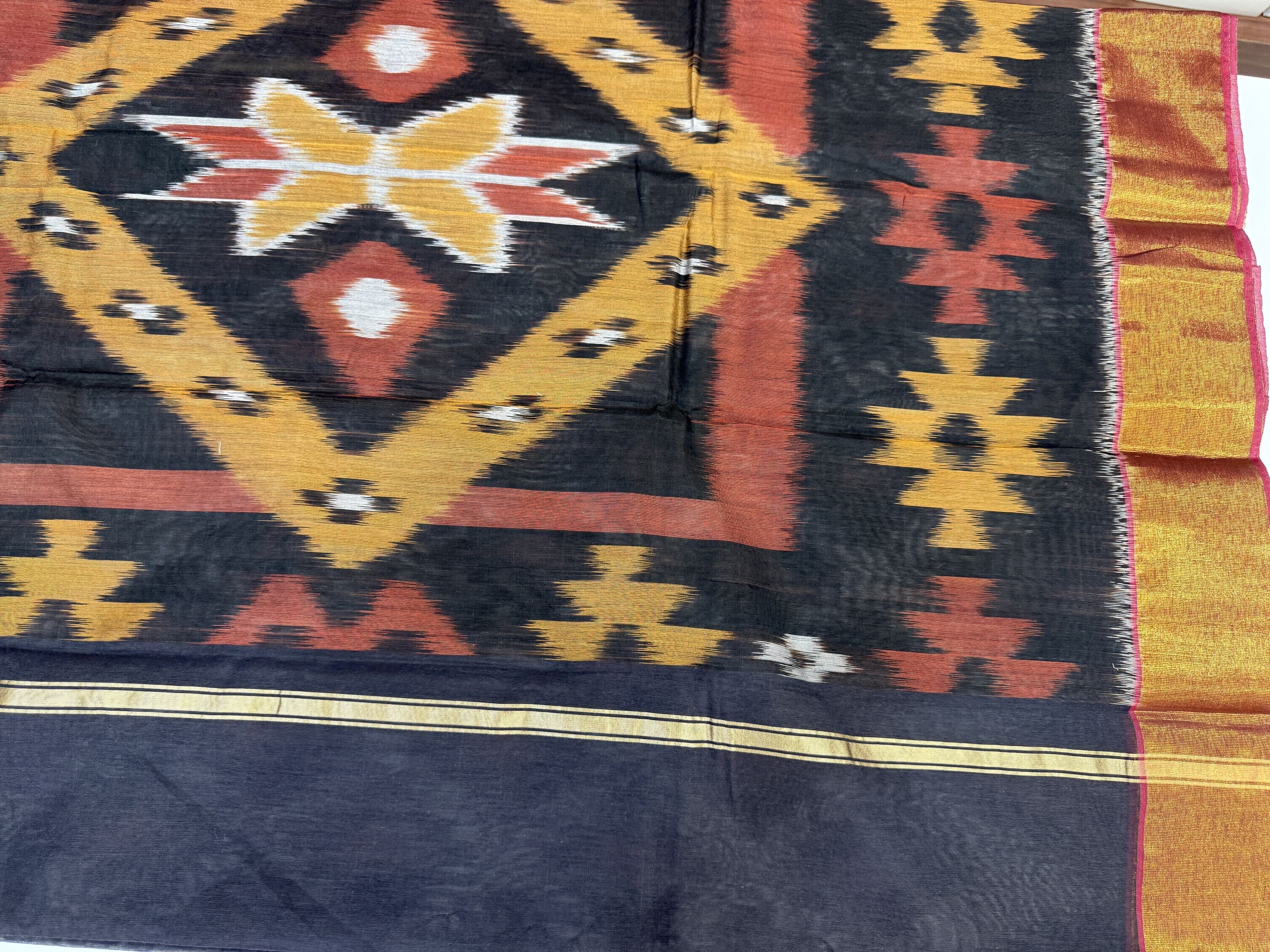 Poochampalli Silk cotton Saree in Ikkat pattern with zari Border & Tassels attached in  Pallu . Blouse plain in Black Colour.
