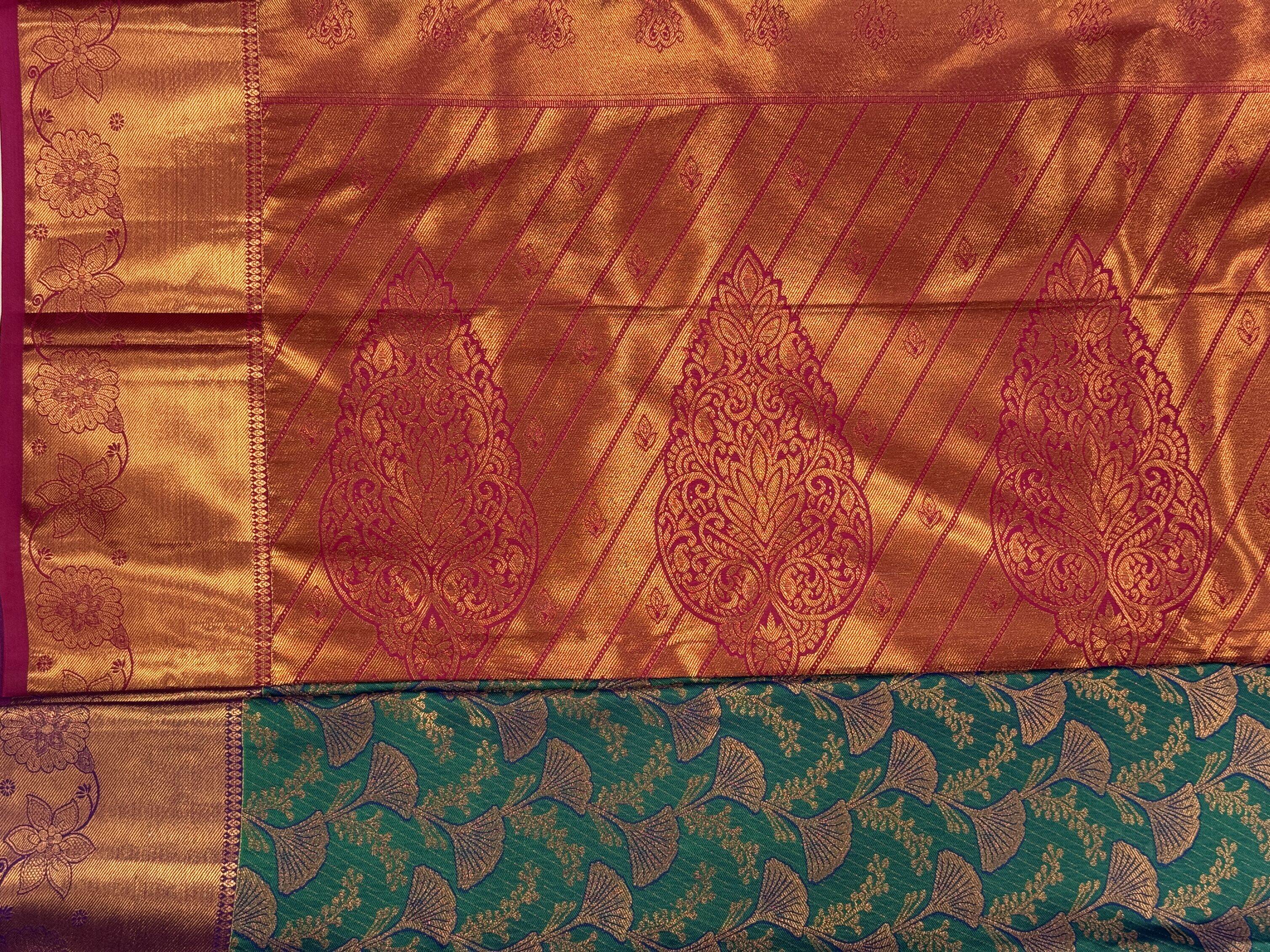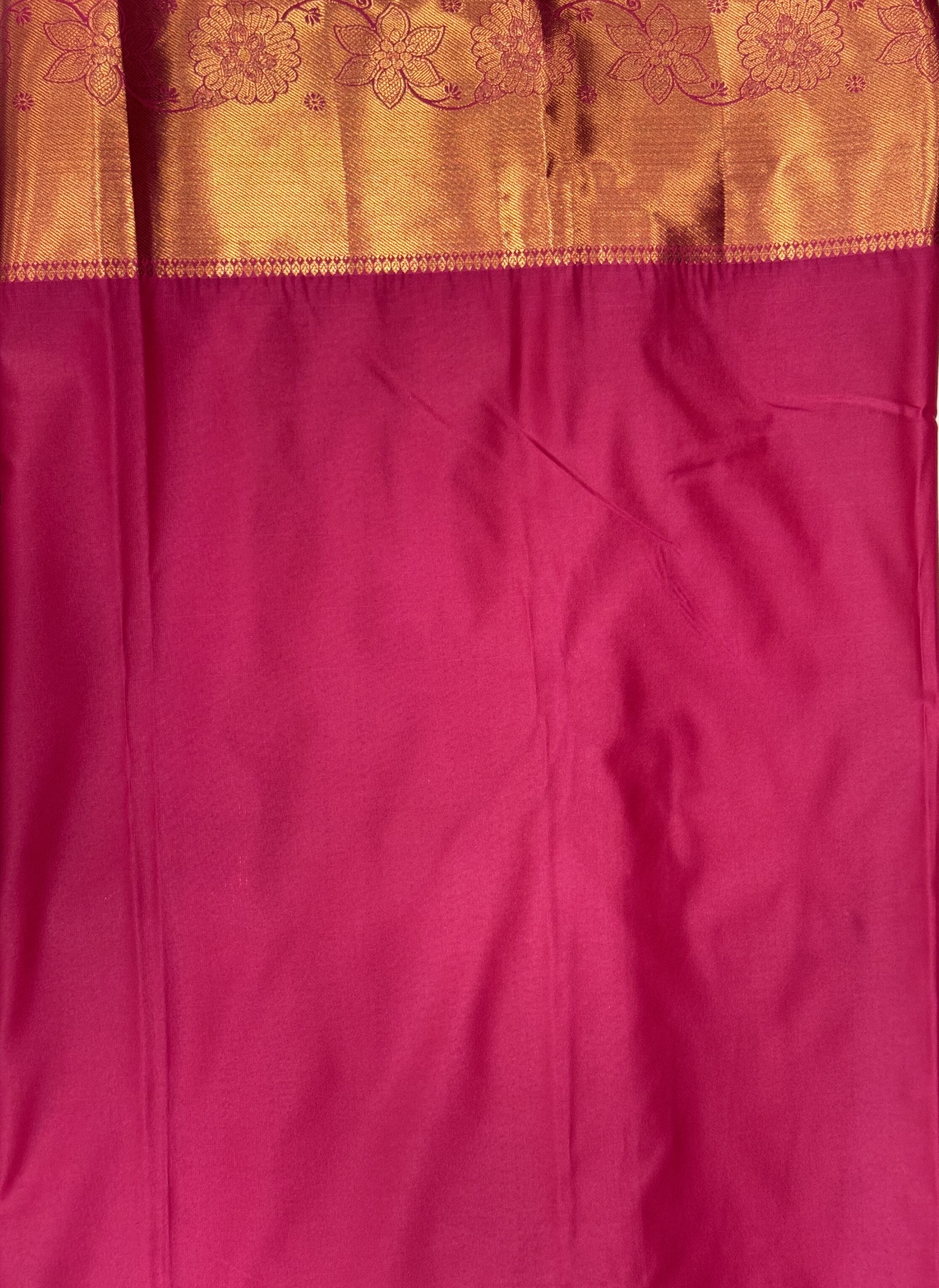 Blue Silk Saree with Pinkish violet Golden Zari Border in 6 Inches with floral Pattern. Plain Pink Blouse with Golden Zari.
