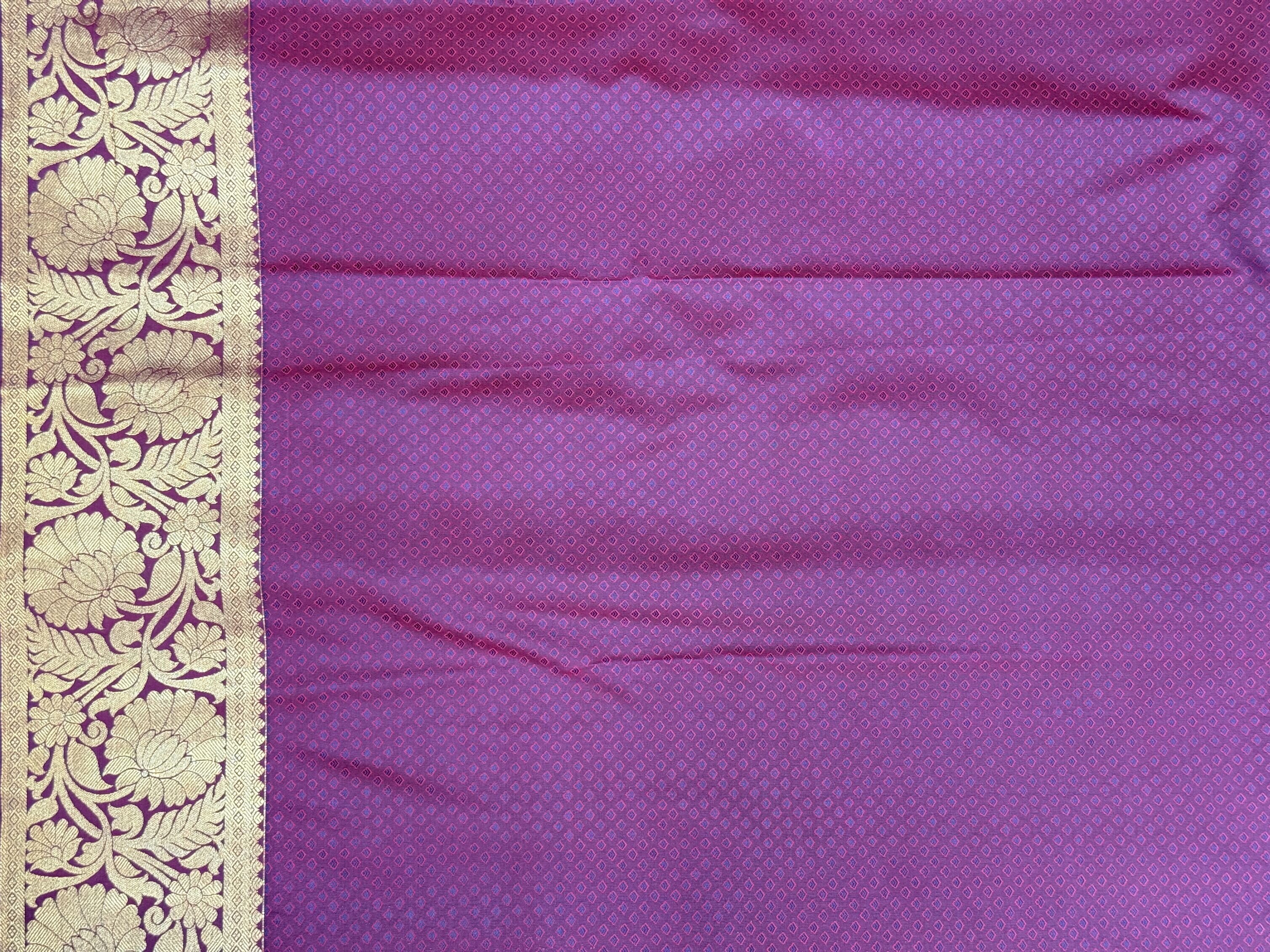 Pink Silk Saree with Violet Golden Zari Border in 6 Inches with floral Pattern. Printed Violet Blouse with Golden Zari.