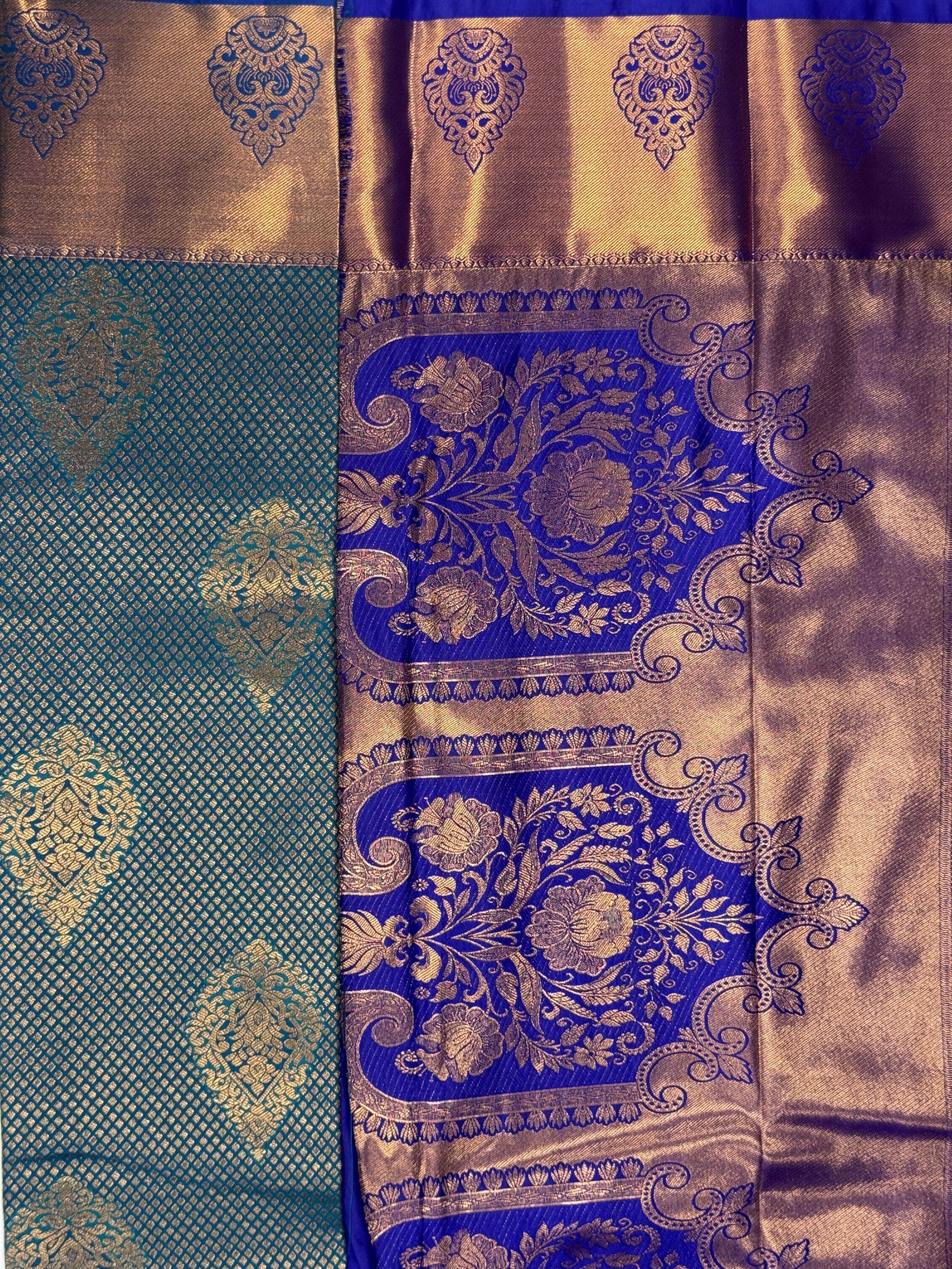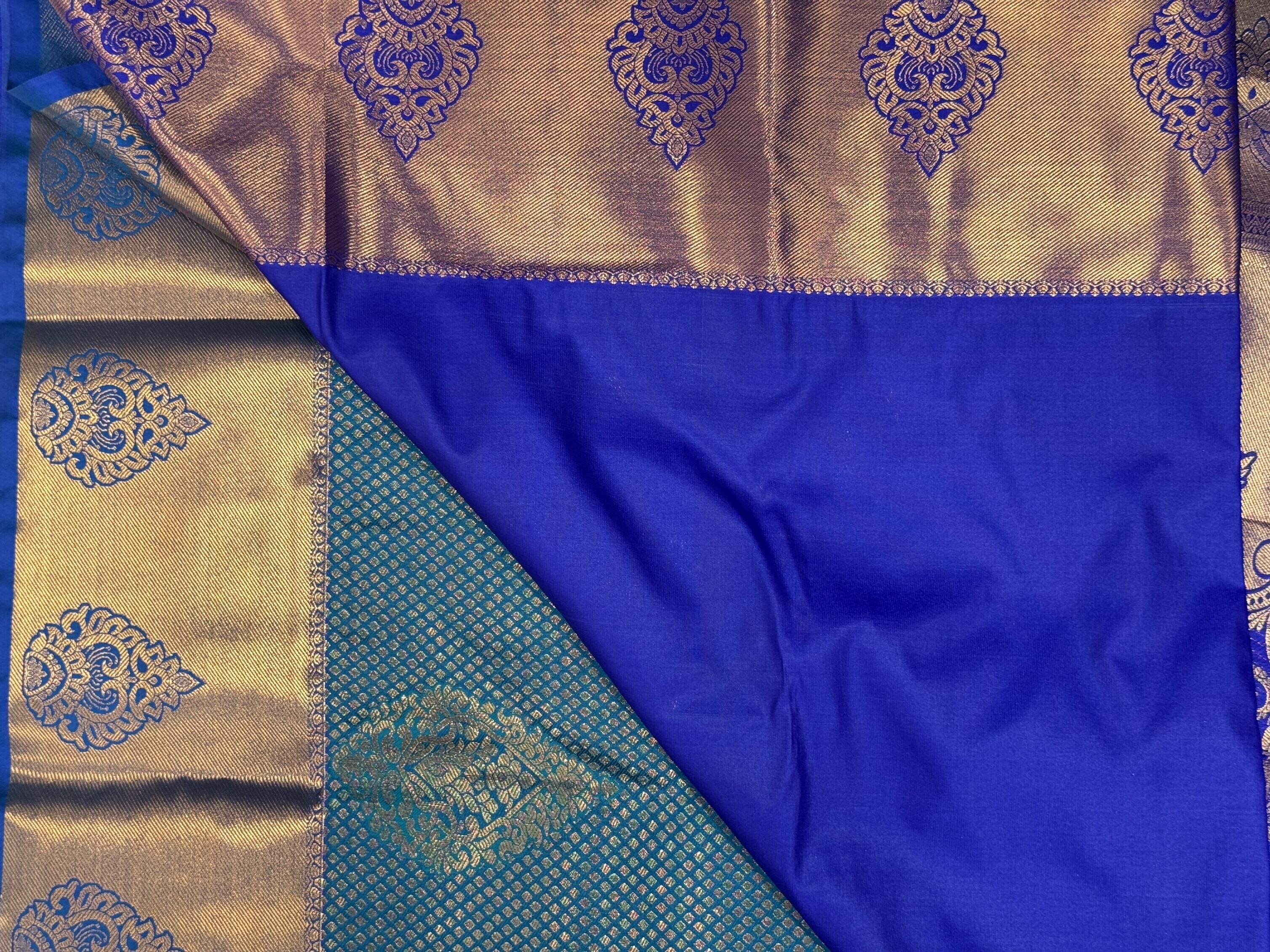 Peacock Blue Silk Saree with Blue Golden Zari Border in 6 Inches with Motif Pattern. Plain blue Blouse with Golden Zari.