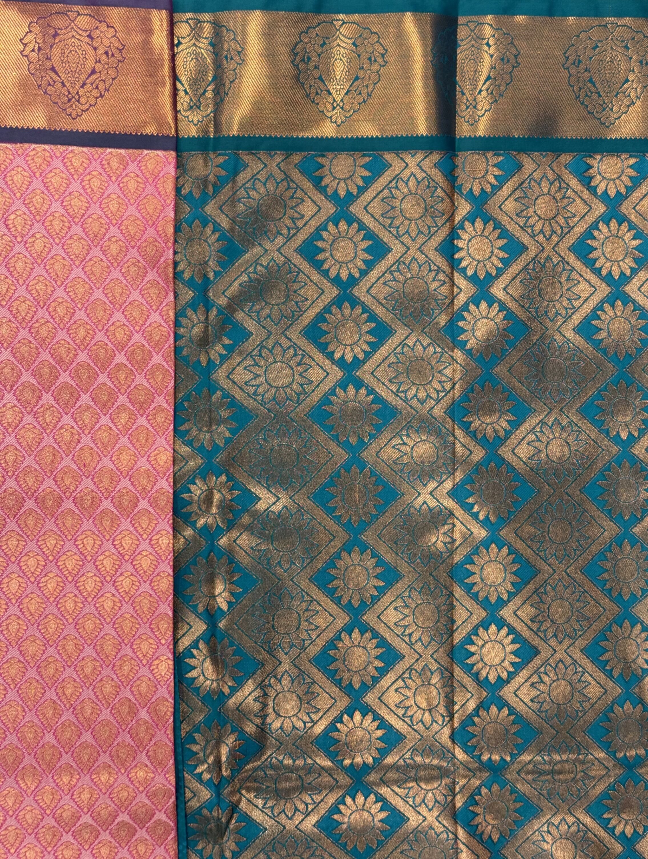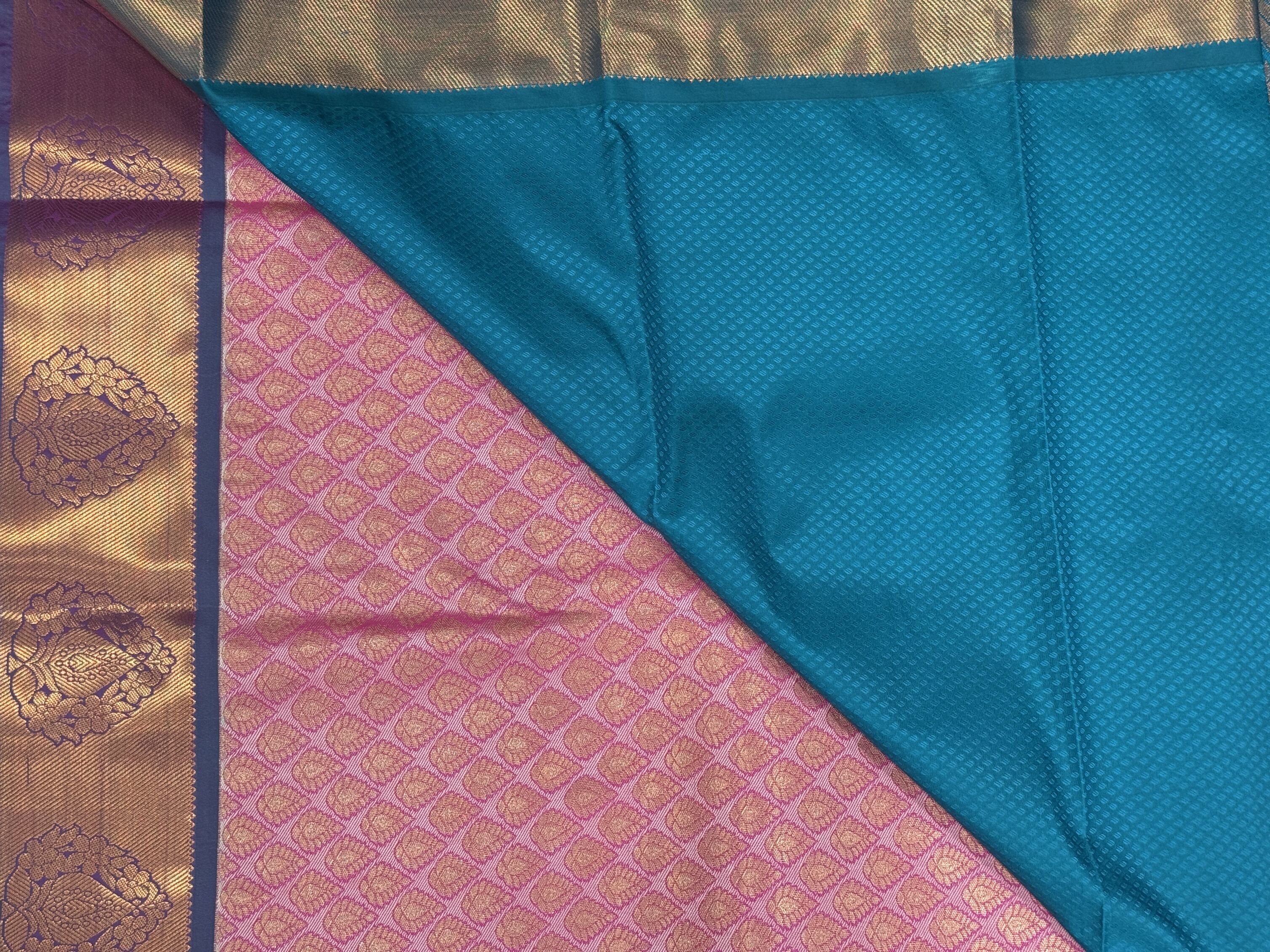 Light Pink Silk Saree with Blue Golden Zari Border in 6 Inches with Motif Pattern. Plain Blue Blouse with Golden Zari.