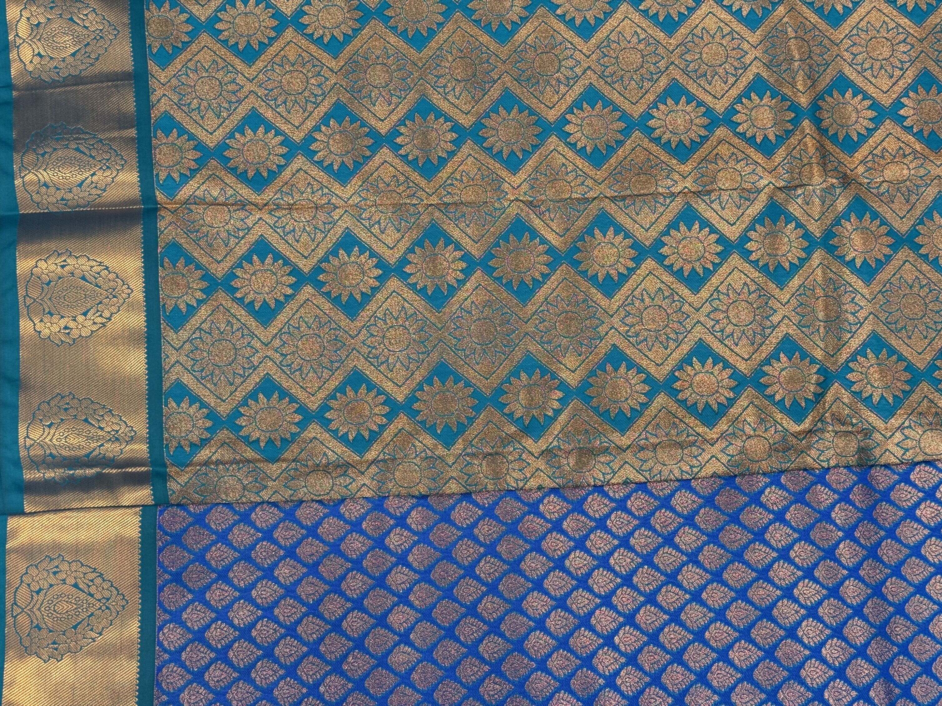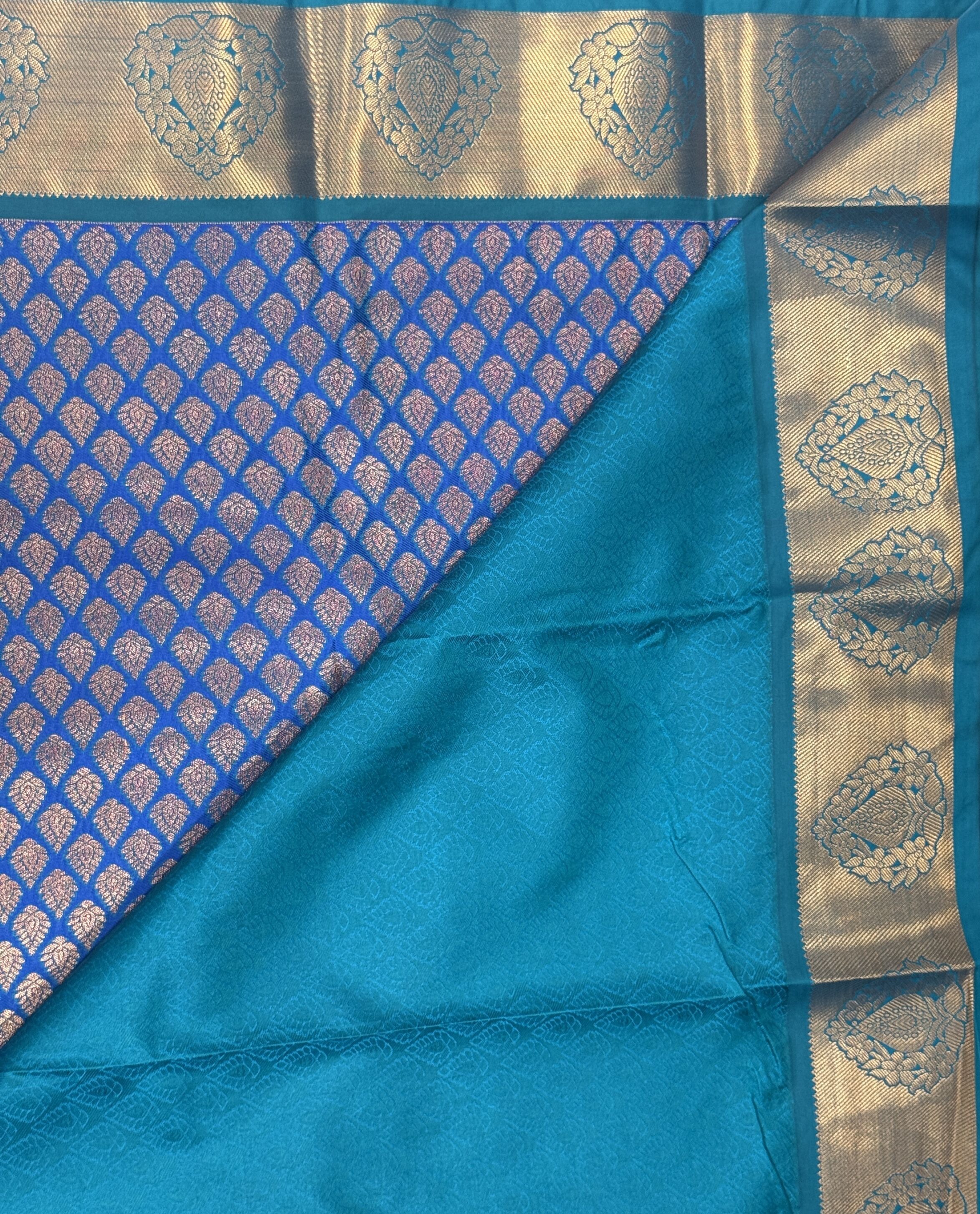 Ink Blue Silk Saree with Peacock Green Golden Zari Border in 6 Inches with Motif Pattern. Printed Peacock Green Blouse with Golden Zari.