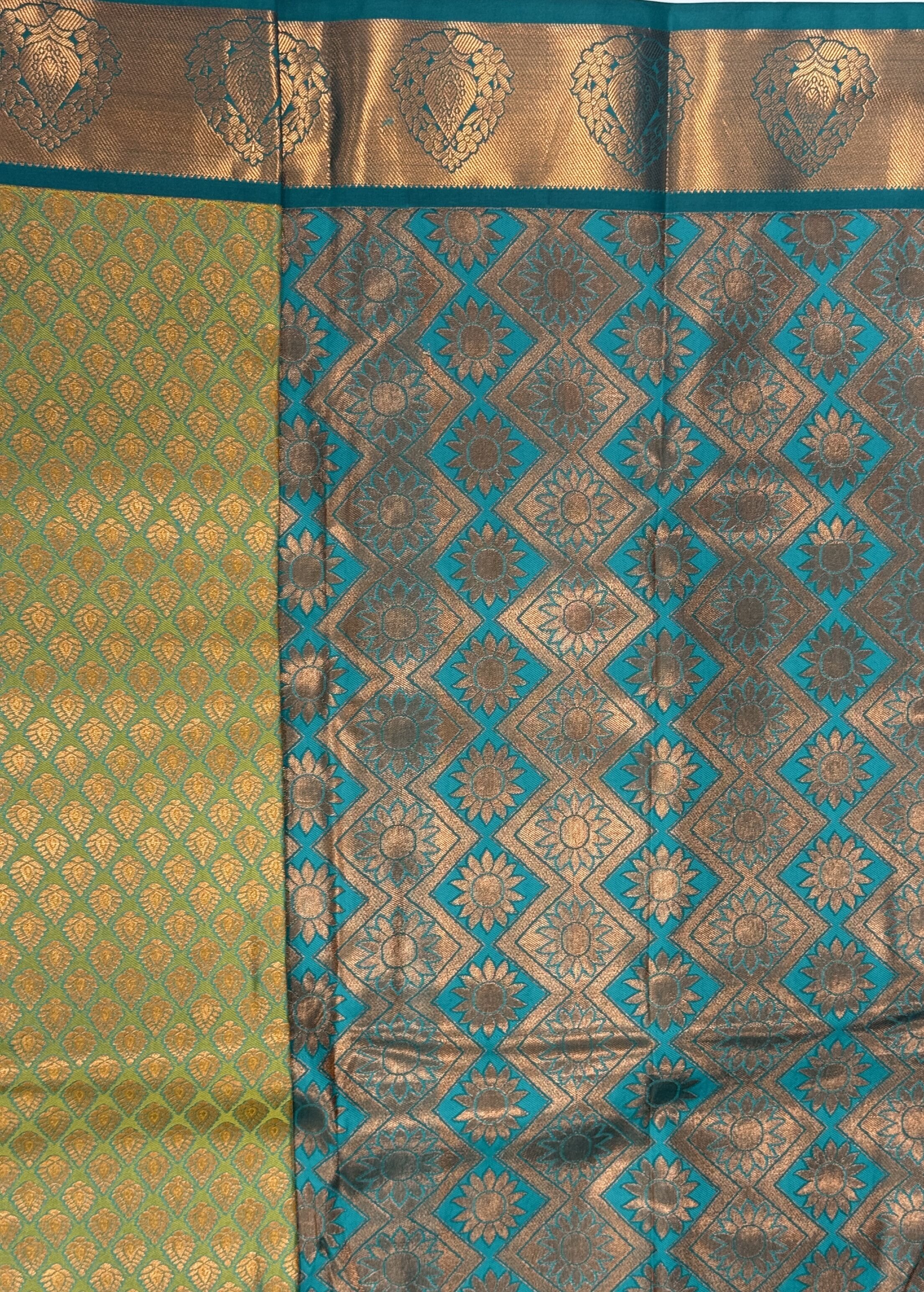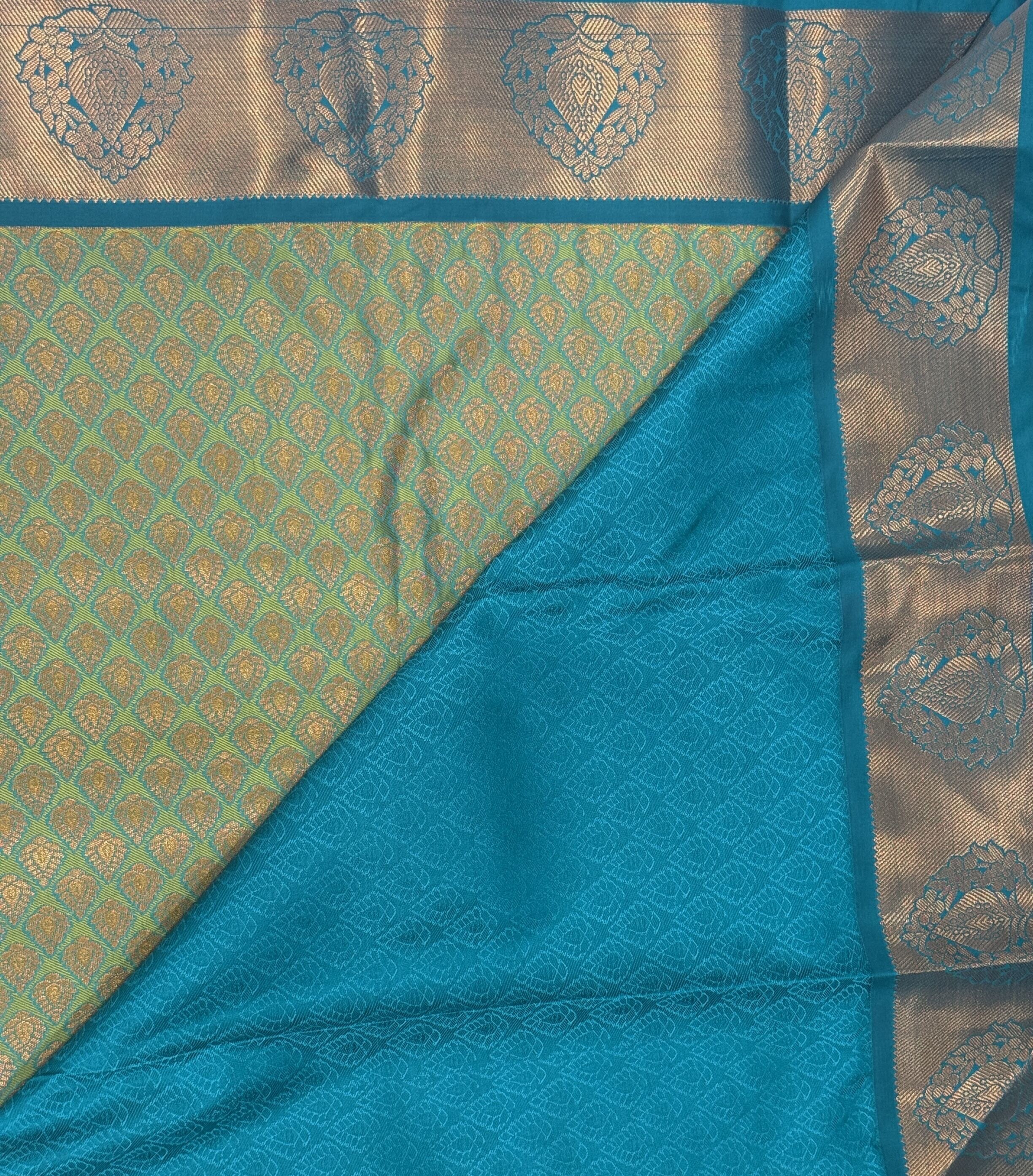 Turquoise Green Silk Saree with Peacock Green Golden Zari Border in 6 Inches with Motif Pattern. Printed Peacock Green Blouse with Golden Zari.