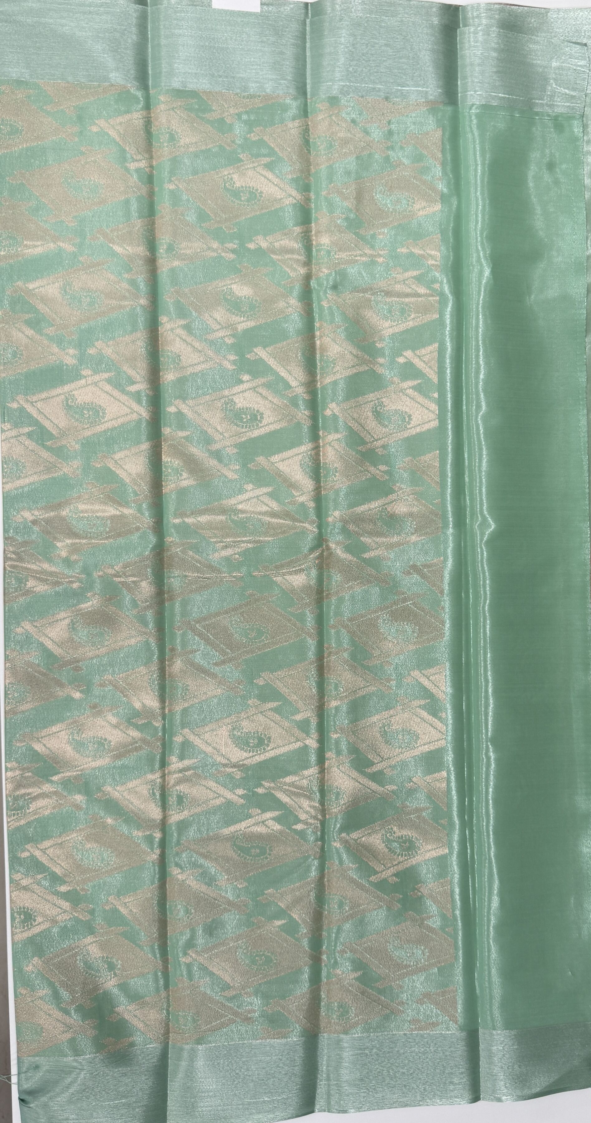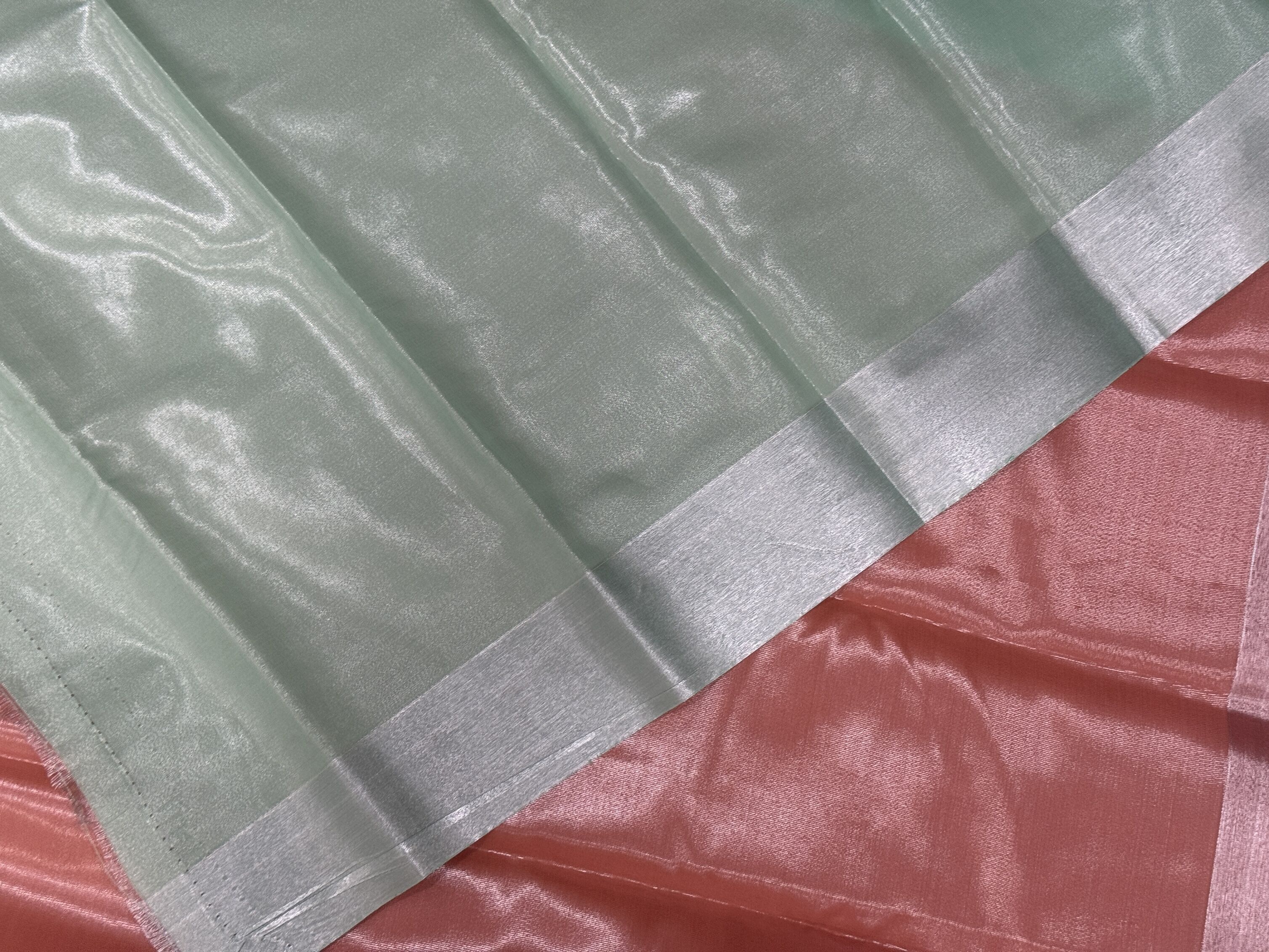 Dark peach Colour soft tissue saree with floral patterns and plain silver Zari border,  Colour blouse with plain Silver Zari border.