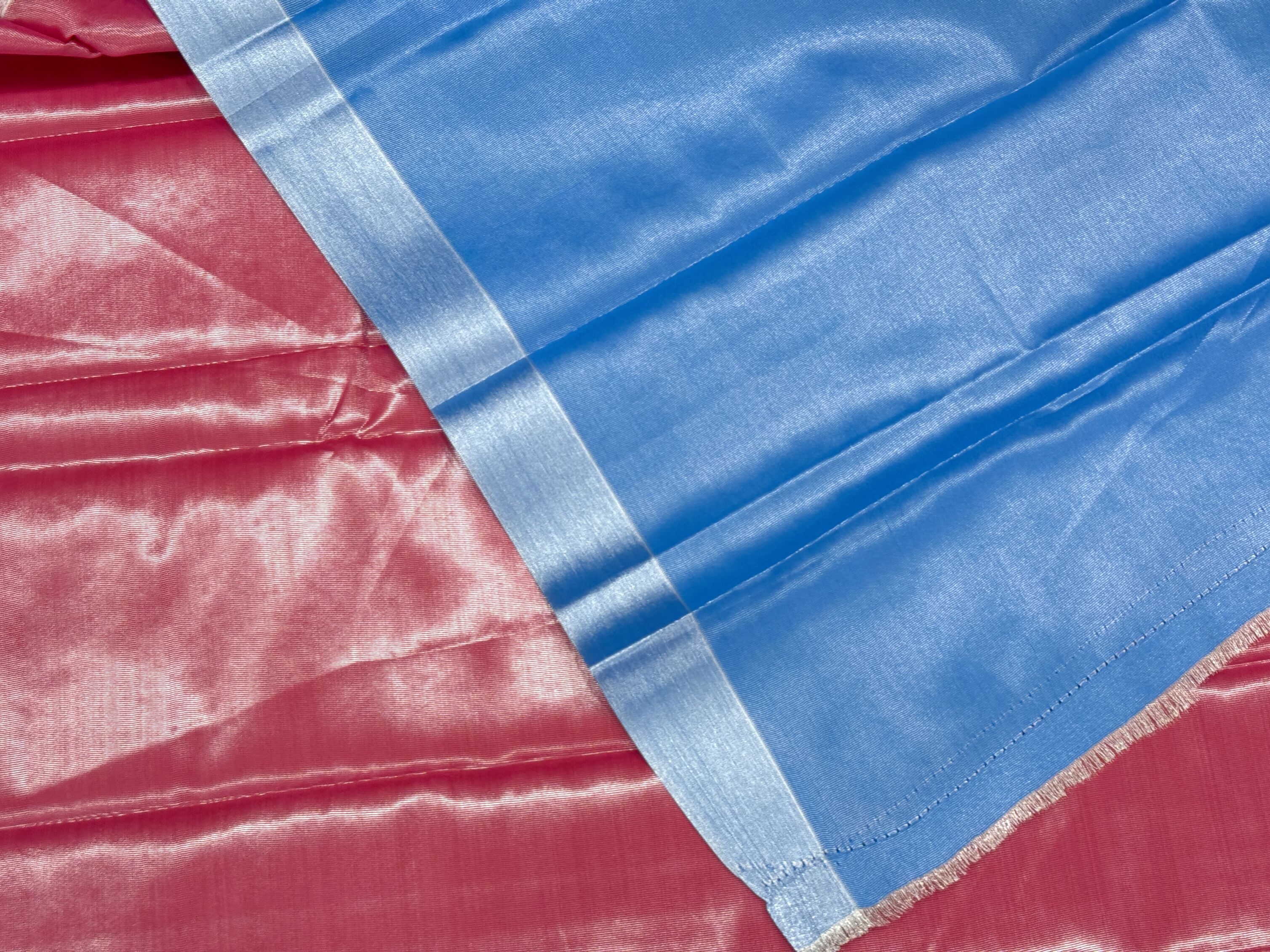 Pink Colour soft tissue saree with floral patterns and plain silver Zari border,  Blue colour blouse with plain Silver Zari border.