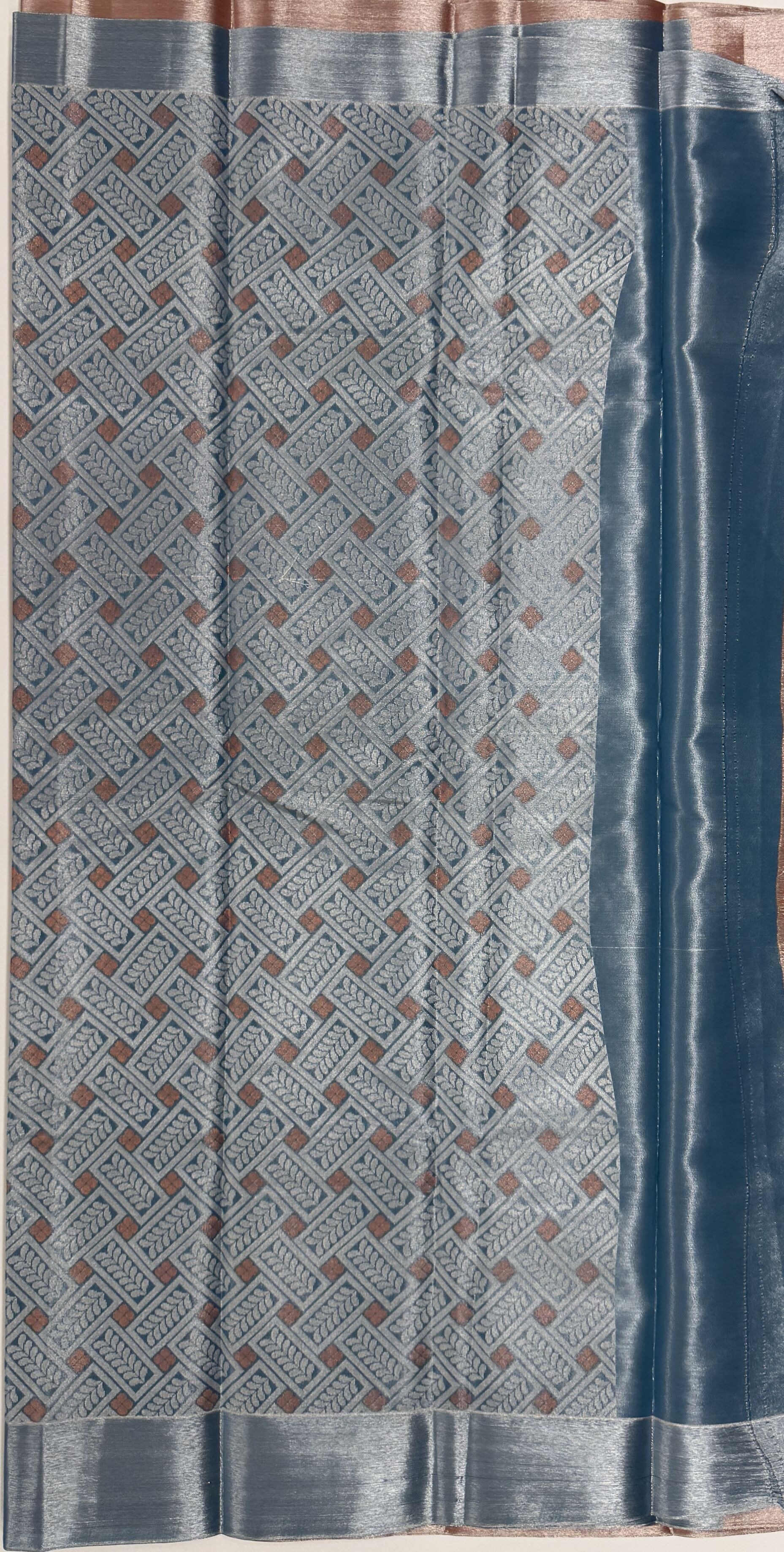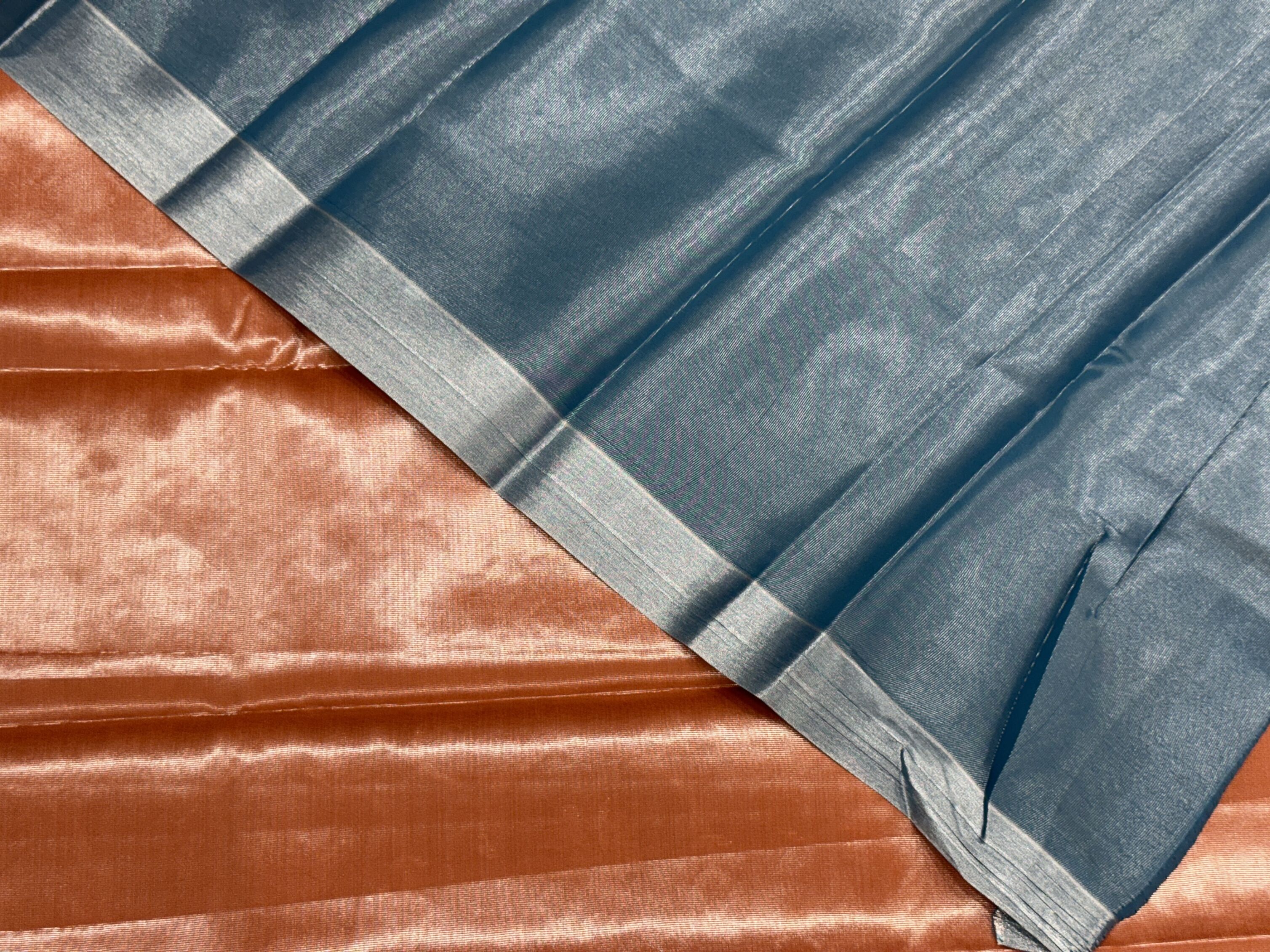 Rustic Orange Colour soft tissue saree with floral patterns and plain silver Zari border, Light blue Colour blouse with plain Silver Zari border.