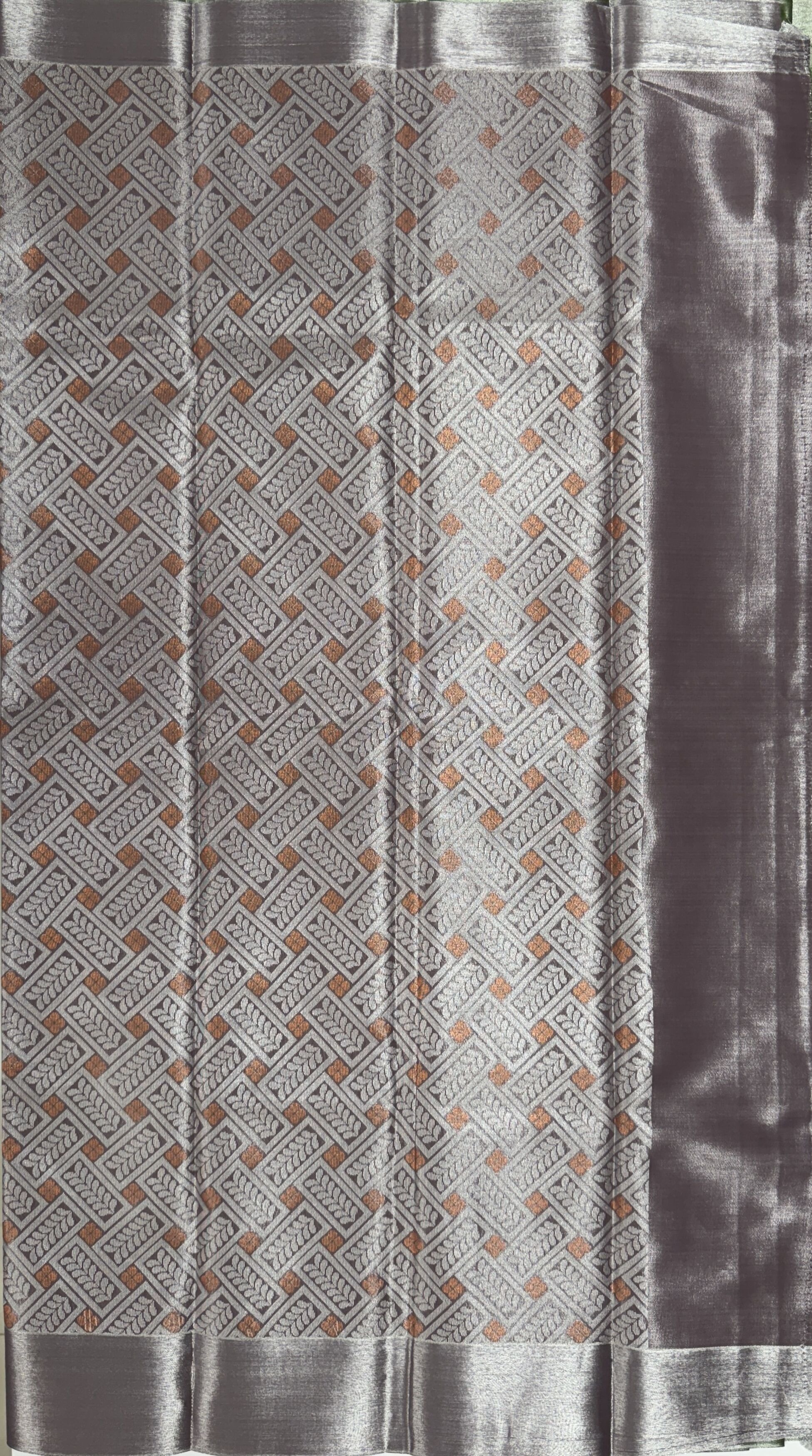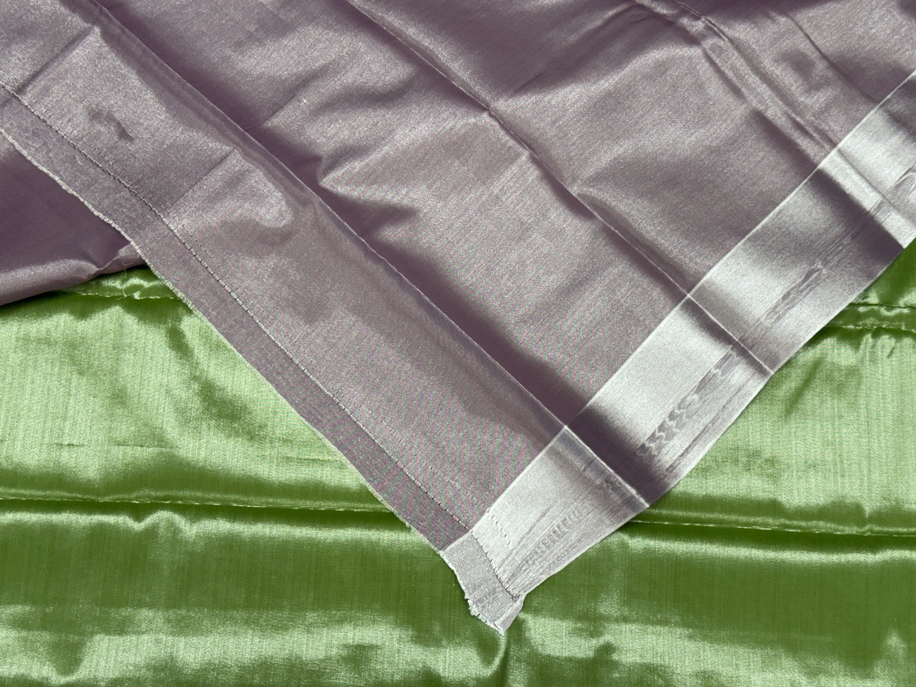 Leaf Green Colour soft tissue saree with floral patterns and plain silver Zari border, Lavender Colour blouse with plain Silver Zari border.