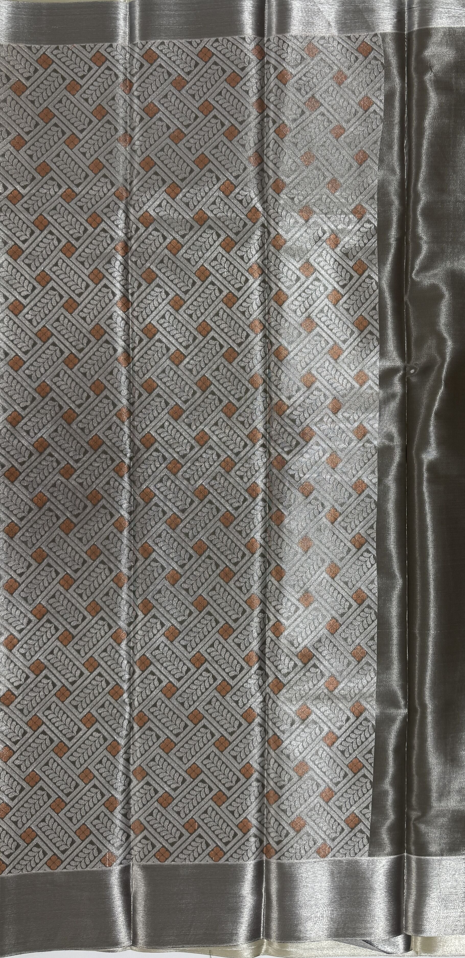Cream Colour soft tissue saree with floral patterns and plain silver Zari border,  Silver Grey Colour blouse with plain Silver Zari border.