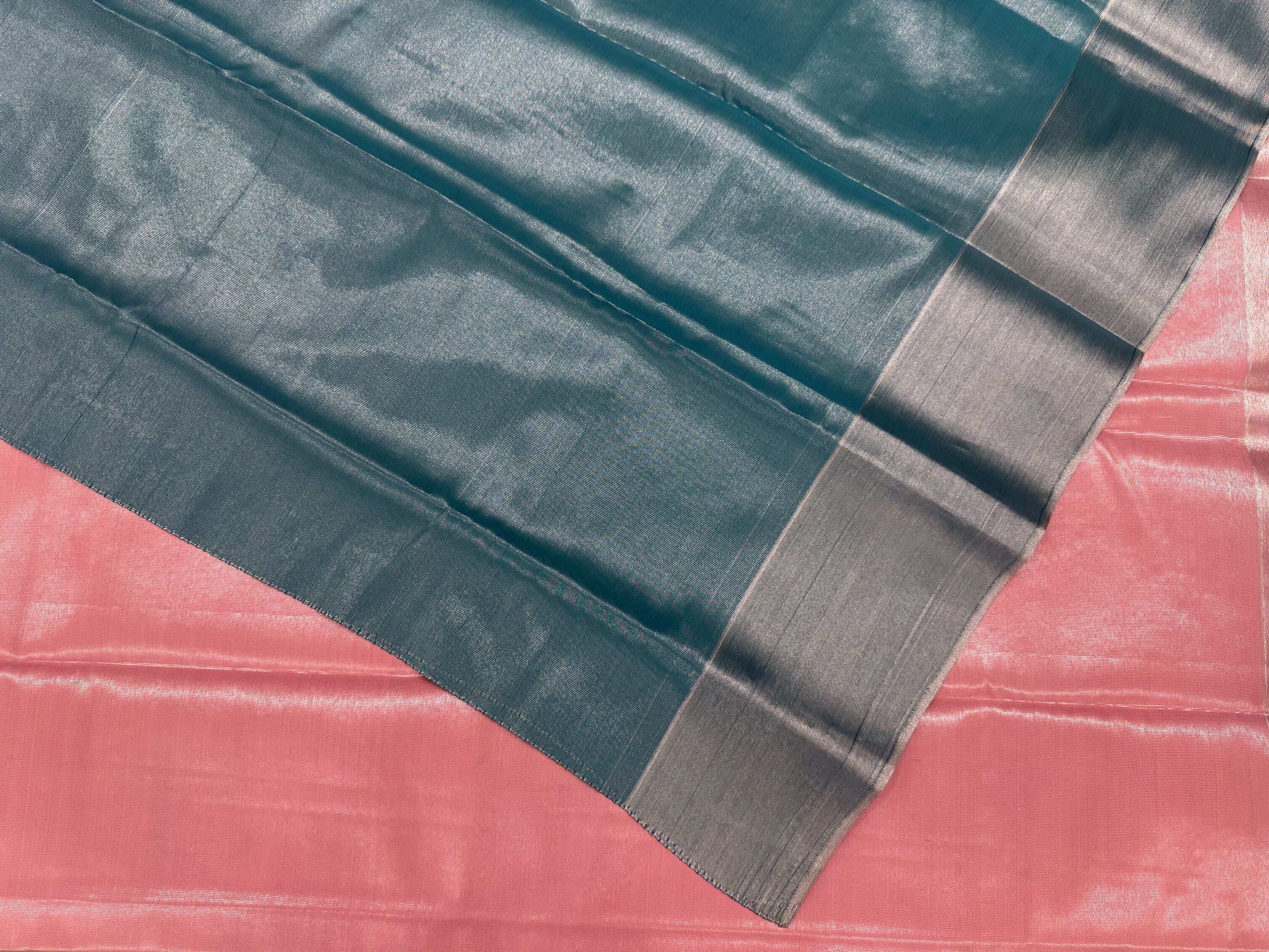 Onion Pink Colour soft tissue saree with floral patterns and plain silver Zari border, Silver Grey Colour blouse with plain Silver Zari border.