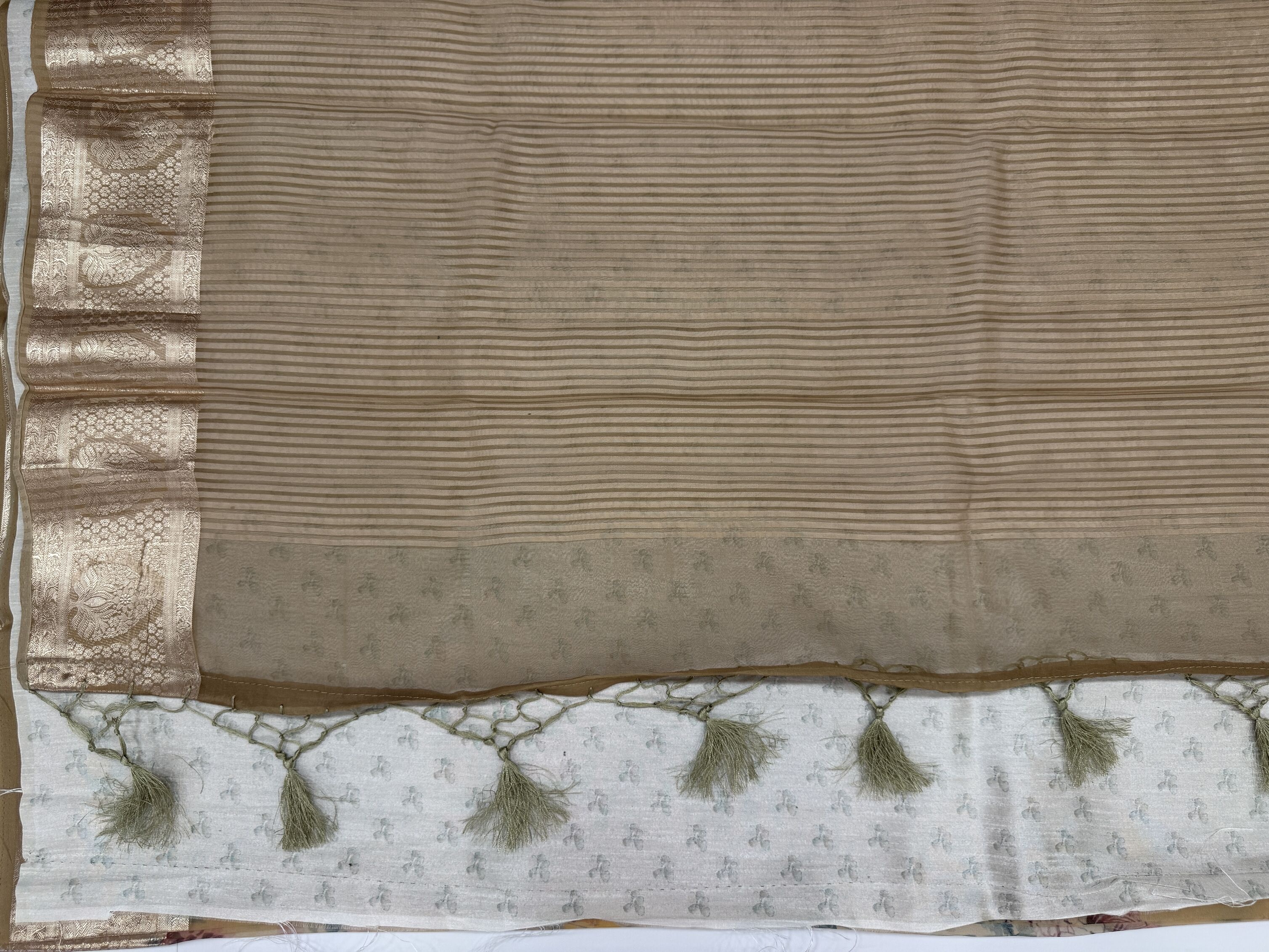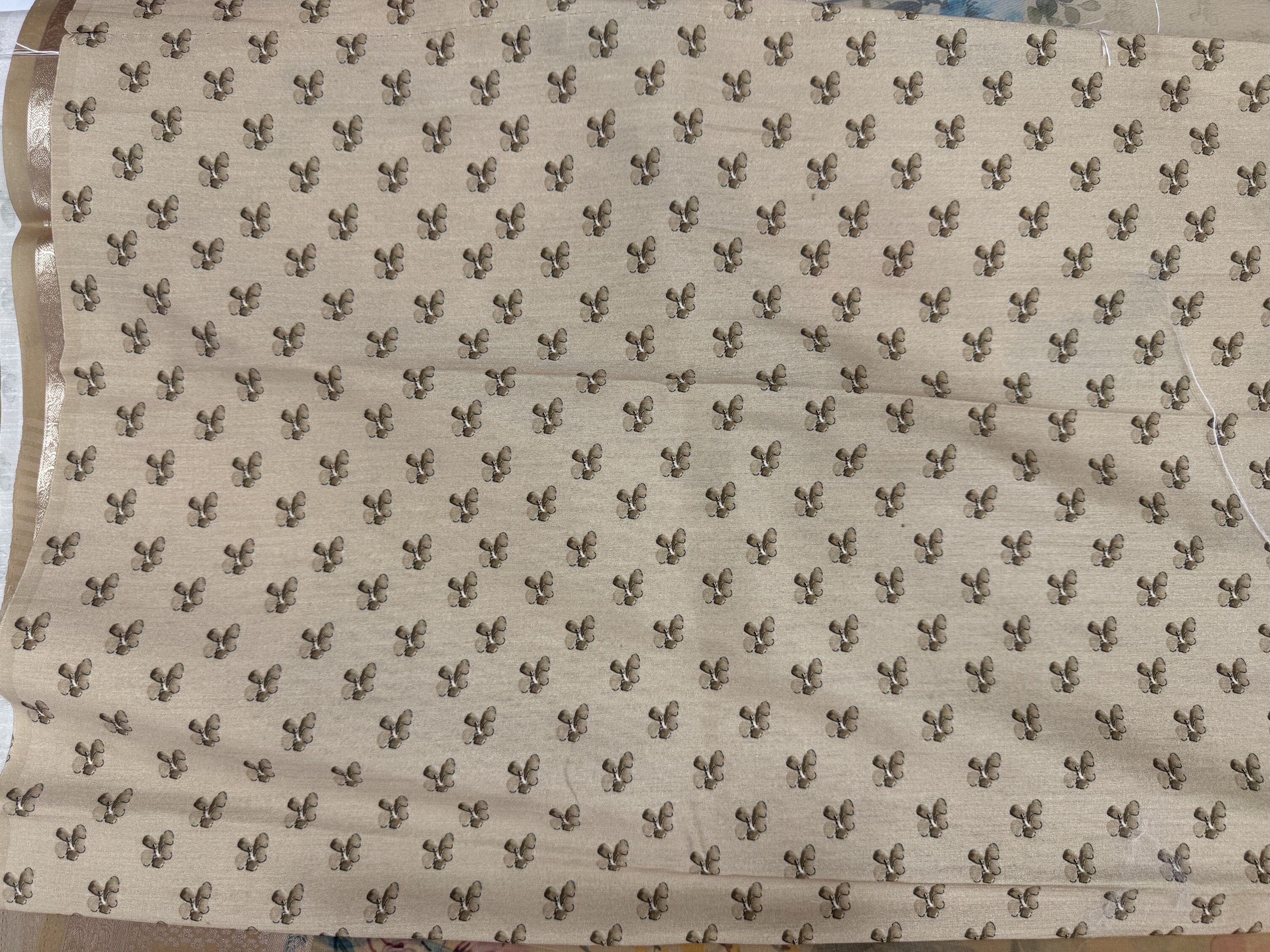 Cream Colour Floral Printed Organza saree with Jacquard weave paisley motifs border, Cream Colour blouse with small floral prints.