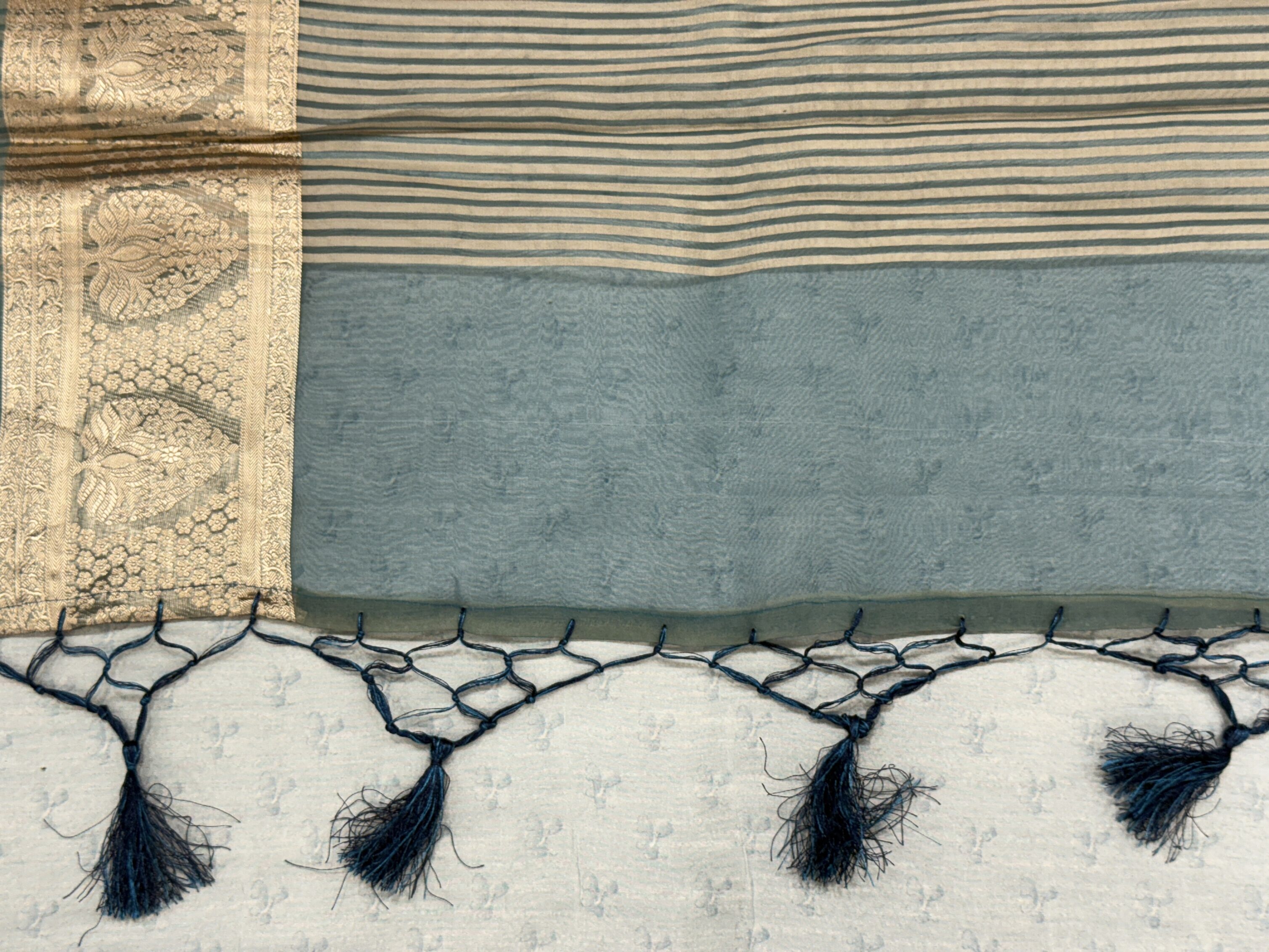 Blue Colour Floral Printed Organza saree with Jacquard weave paisley motifs border, Blue Colour blouse with small floral prints.