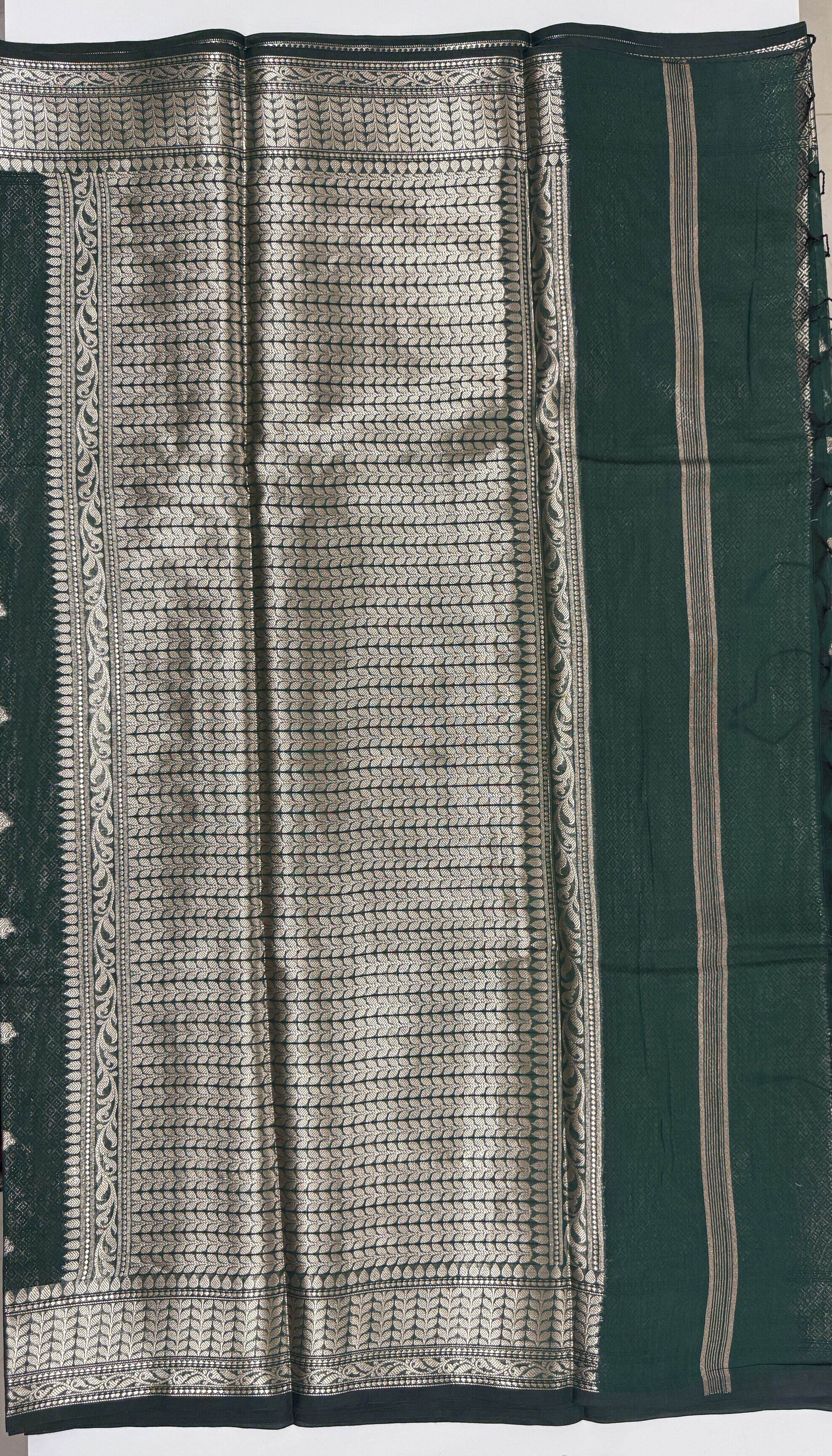 Dark Green colour Banarasi silk saree with silver brocade border and pallu with traditioal floral motifs, Dark Green colour blouse with silver brocade weavings .